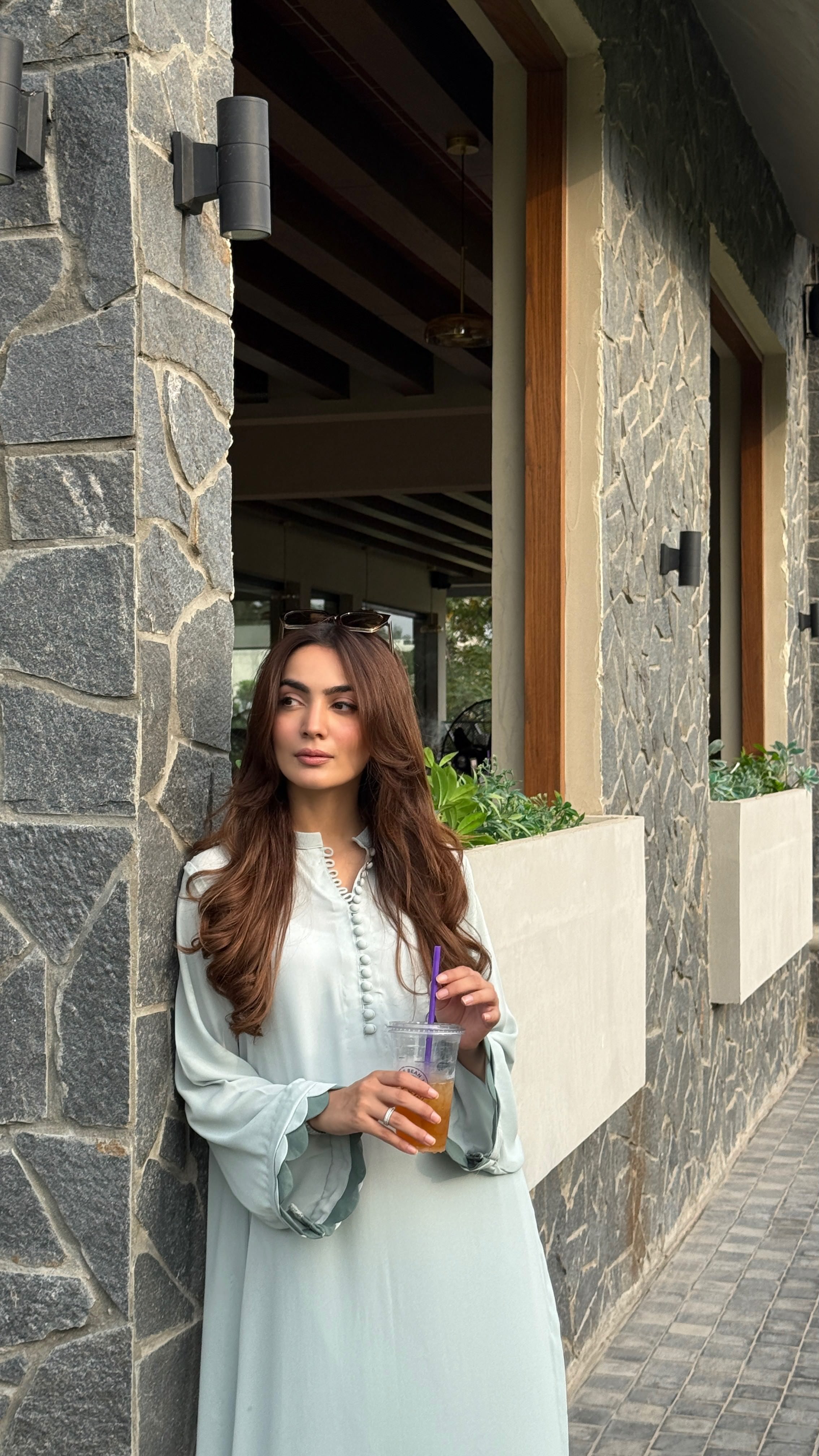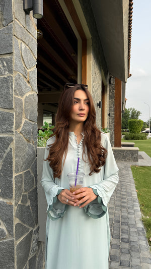 His elegant sage green dress is designed in georgette fabric, giving it a soft and graceful flow. The long shirt features delicate scalloped detailing on both sleeves and hemline, adding a feminine and refined touch to the overall look.The neckline is kept simple to maintain the dress's sophistication charm. The double shade effect enhances the outfit's depth and dimension creating a subtle yet eye-catching contrast scallopes paired with strait paints.