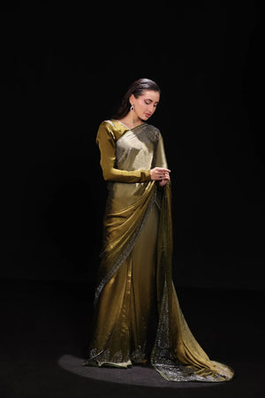 Olive Opulence is where heritage meets haute couture. The earthy ombre tones of olive silk shimmer with every step, while delicate rhinestones add a whisper of extravagance. Designed for the discerning dresser, the blouse’s sculptural cutout design completes the look with finesse.