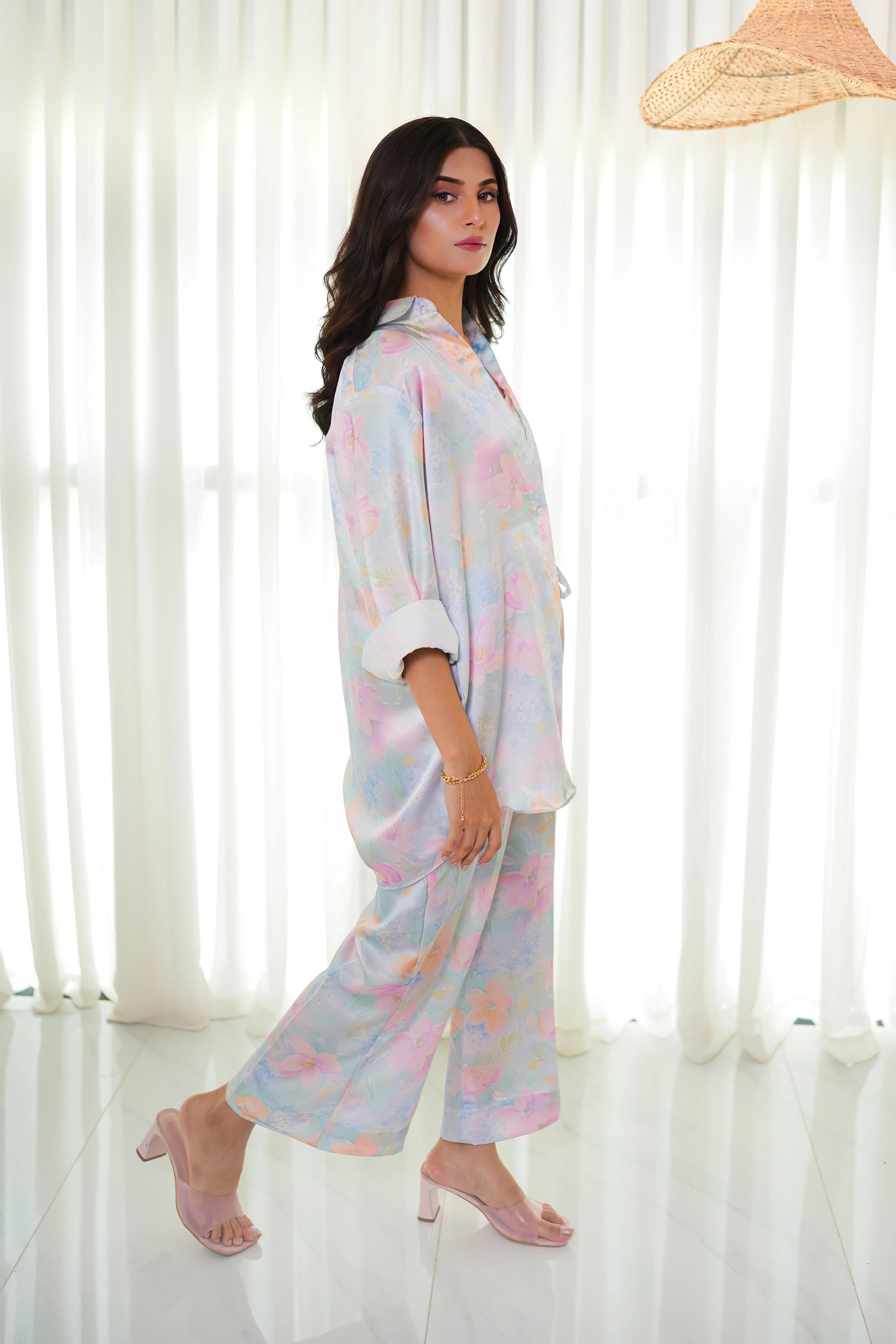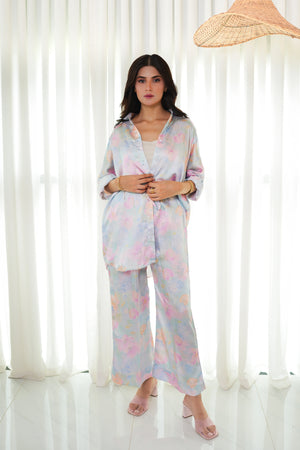 Step into refined elegance with our florence silk matching cord set in a dreamy pastel floral print. The button-down shirt exudes sophistication with its smooth, flowy silhouette, while the straight-cut trousers provide a sleek and comfortable fit