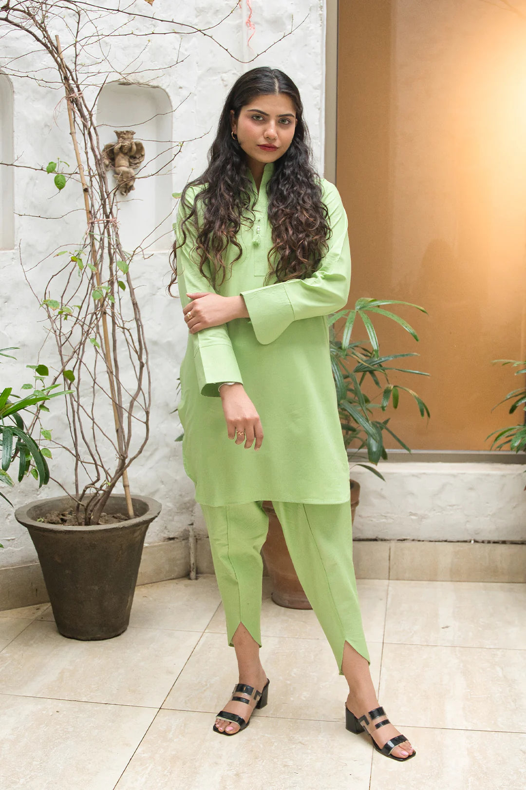 Featuring a classic round collar neckline with a stylish placket, cuffed sleeves, and a chic tulip shalwar for an effortlessly elegant look.