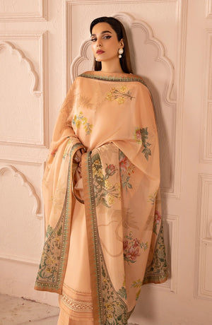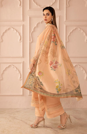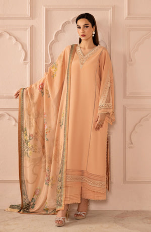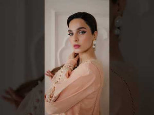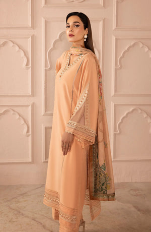 This soft peach-colored outfit is a graceful and elegant choice for formal and semi-formal events. The long kurta is designed with delicate embroidery along the neckline and sleeves, adding a touch of charm. The simple V-neck gives the outfit a classic, timeless look, while the embroidered details at the cuffs and hem elevate the overall style.The matching sheer dupatta features intricate floral patterns, complementing the outfit perfectly and adding a light, feminine touch. The soft flow of the fabric ensures comfort while maintaining a polished and elegant appearance.