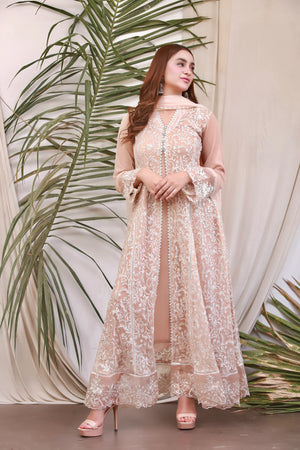 - Step out in style with our latest front open shirt coupled with separate chiffon inner. The embroidery is crafted with resham, lace which is giving an elegant touch to this gorgeous outfit. This sophisticated shirt is paired with a narrow crepe pant.The design serves as the ultimate look to make a classic entrance in formal gatherings.