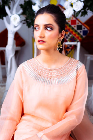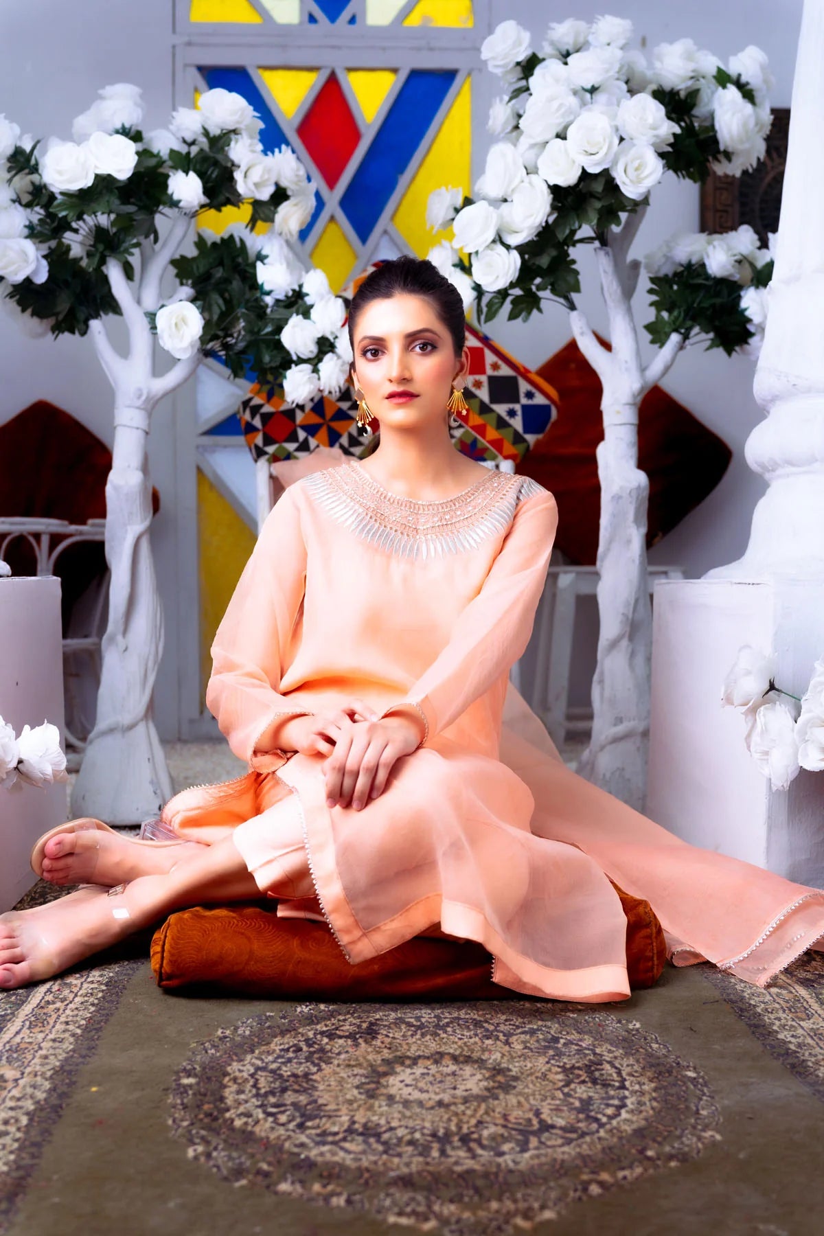 - Step into the world of elegance with our Peachy Puff Organza Dress, a perfect blend of traditional and modern aesthetics. The dress is made with premium quality tissue organza fabric in a soft and delicate peachy puff hue, which adds a feminine touch to the overall look. The dress is adorned with exquisite 3D tilla and thread work, which gives it a unique and eye-catching texture. The intricate work is spread all over neck line of the dress, making it a true masterpiece. The shirt features all-over piping with hemming, adding to the dress’s charm. The dress comes with a tissue organza dupatta with a dual side gotti laced border, which completes the overall look. The straight cut design and blended raw silk trouser provide comfort and flexibility, making it perfect for any occasion.