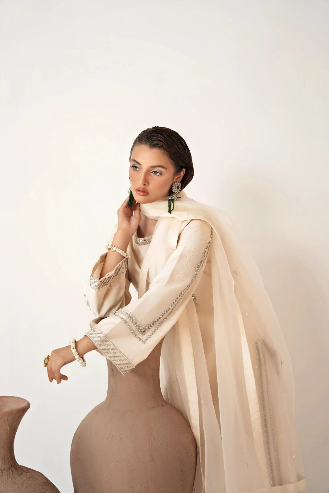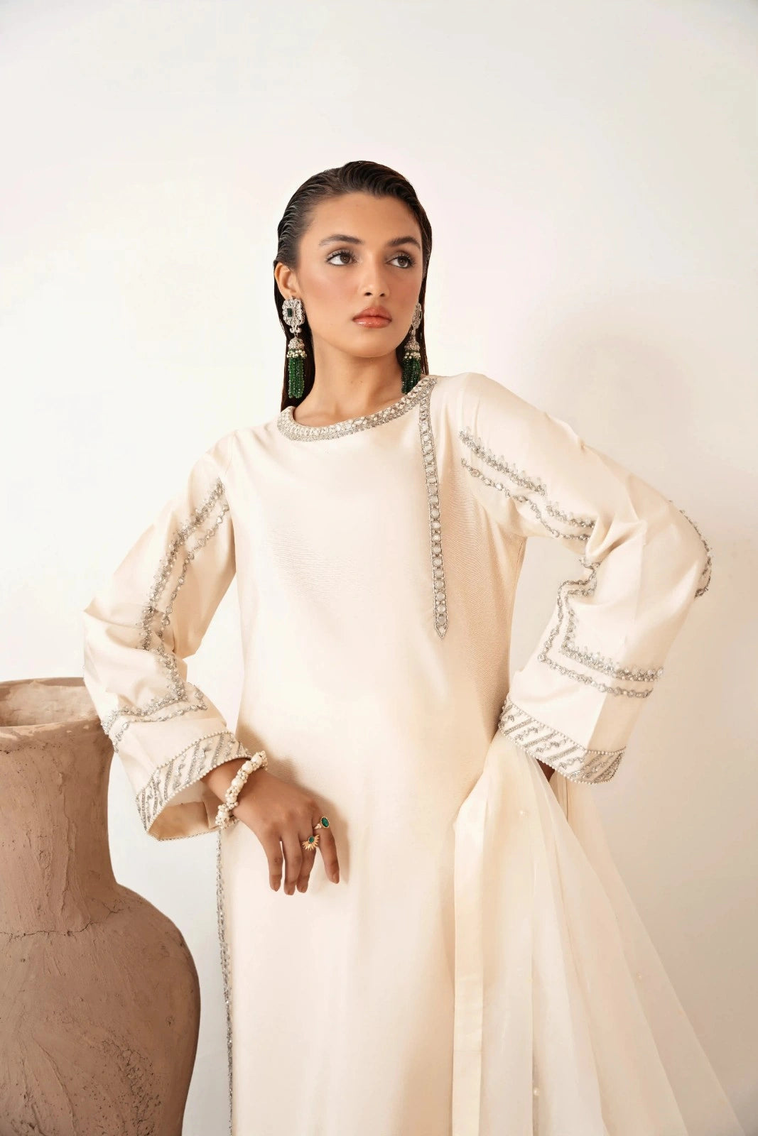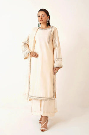 - Presenting ‘Pearl’, a majestic ivory raw silk shirt that shines with intricate pearl sequins, mirror work, and hand embroidery, creating a truly regal presence. This ensemble weaves a tapestry of light and beauty like a work of art, wrapping you in its ethereal embrace.
