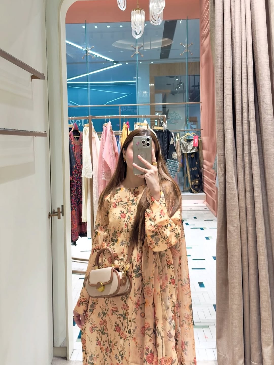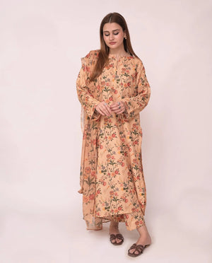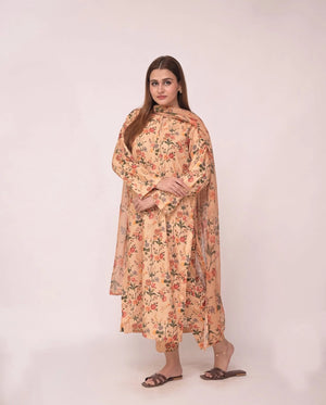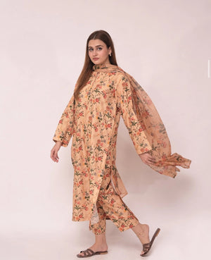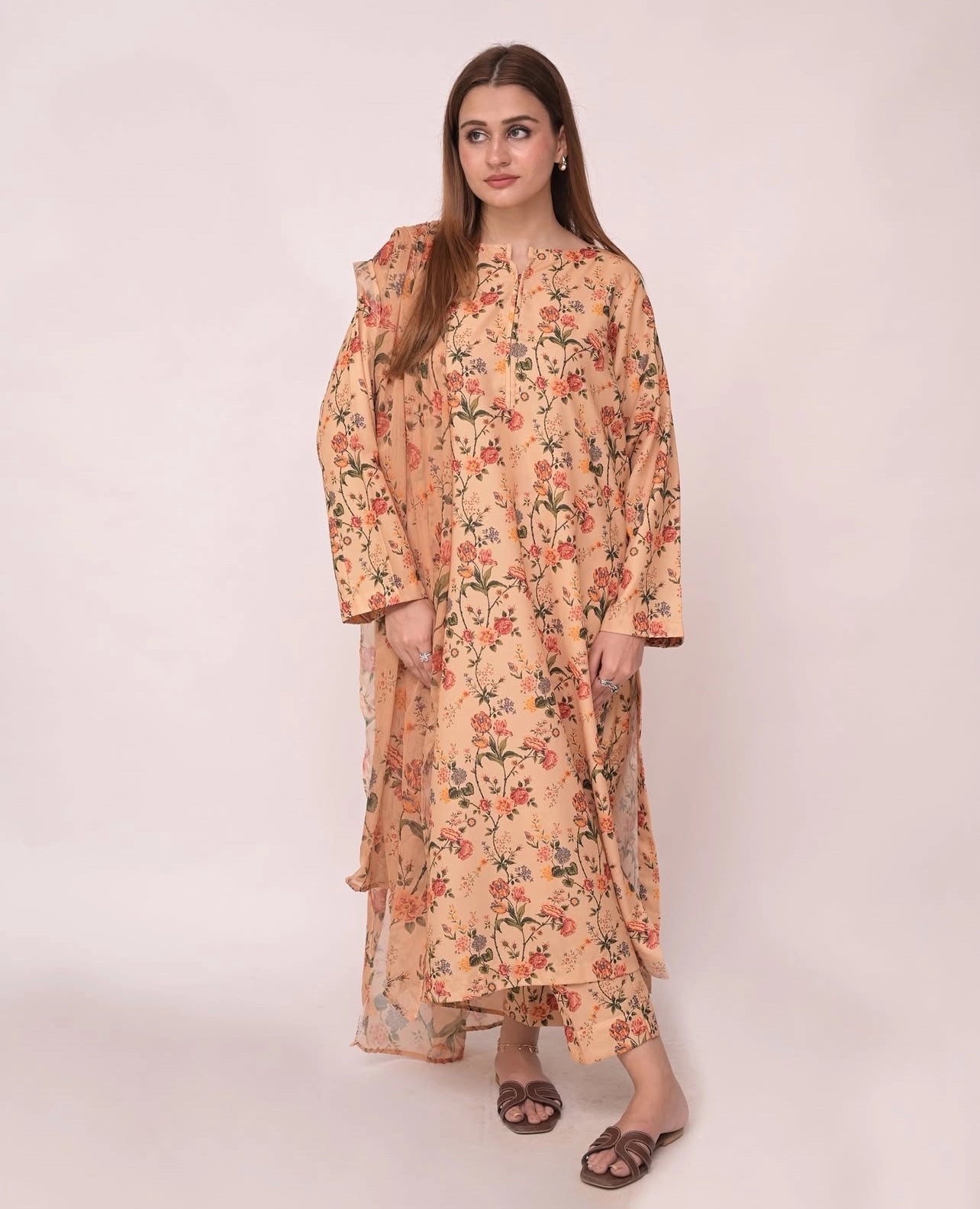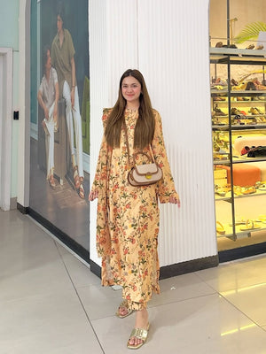 breezy long shirt, blooming with delicate floral prints. Paired with a matching printed trouser and a flowy 2.75-meter chiffon dupatta, this ensemble blends comfort and timeless charm—perfect for daywear with a graceful twist