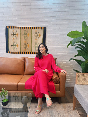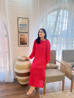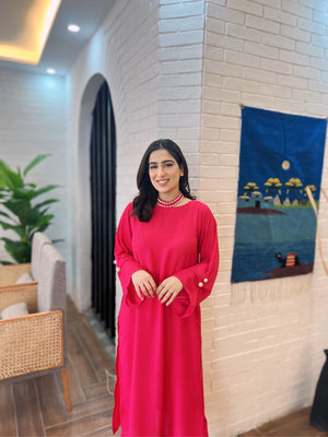 Introducing our pink shirt with embroidered neck – a contemporary classic for the modern wardrobe. Immerse yourself in elegance with the unique hanging neck design with pearls on sleeves, adding a touch of sophistication to your style. Crafted from high-quality fabric, this shirt ensures comfort without compromising on style. The rich dark pink color complements various outfits, making it a versatile choice for any occasion. Elevate your fashion statement with this refined piece, showcasing the perfect blend of trend and timeless appeal.