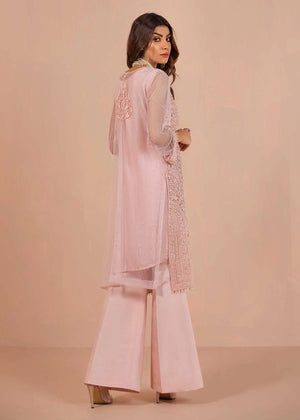 Summer blooms and spring hues combination of pink rose hue embroidered and blended with crystals and pearls making this outfit like a princess walking in rose garden. Net fabric based shirt and raw silk trouser is completely giving it chic look.