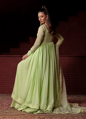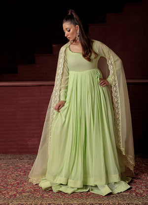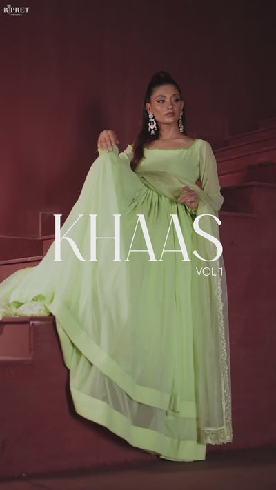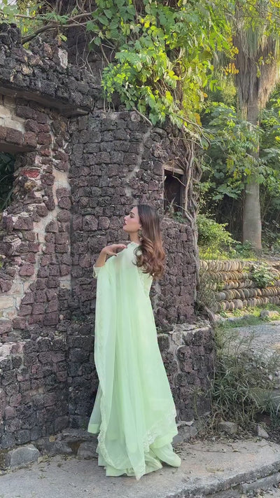 This Flowy set features a crinkle chiffon frock with a remarkable two-tier design that creates an incredible 350+ inches of flare, made with over 20 yards of fabric. The neckline is detailed with crystal laces. Fully lined with Malayi fabric for comfort, this frock offers a voluminous and graceful silhouette. Paired with a soft organza dupatta, featuring a four-sided lace border, this ensemble is perfect for a sophisticated and flowing look.