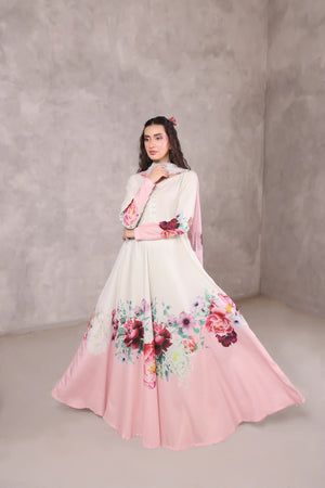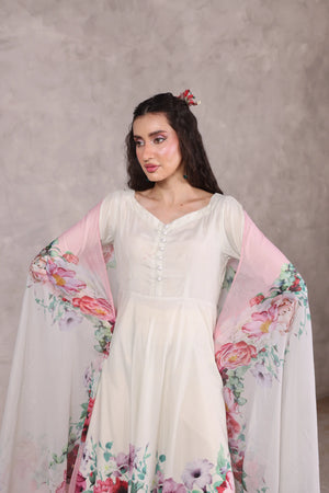Primrose is a 2-piece printed pishwas set featuring a soft polylawn frock with a 250-inch flare. Paired with a printed silk dupatta, it offers a graceful and flowy look.