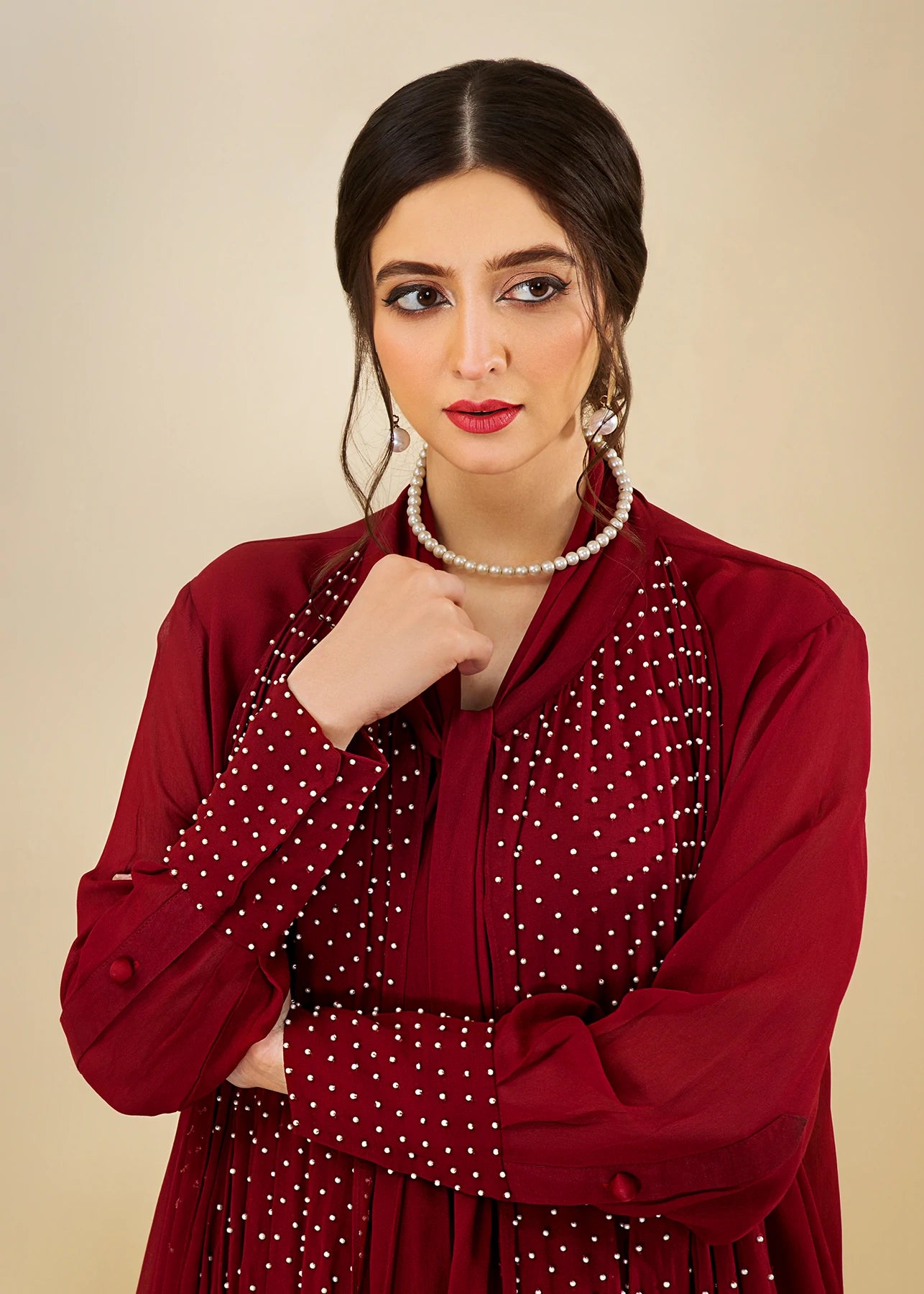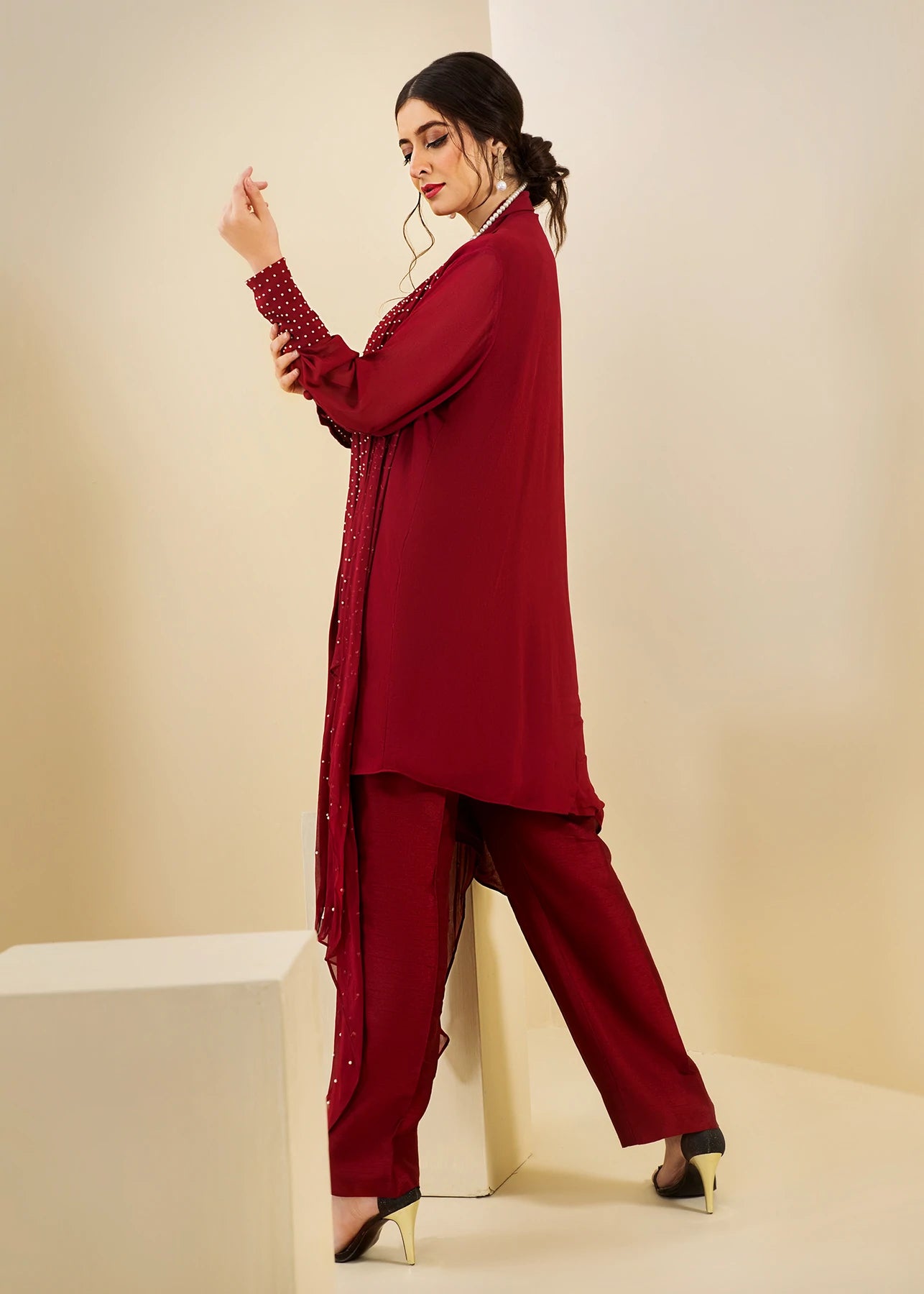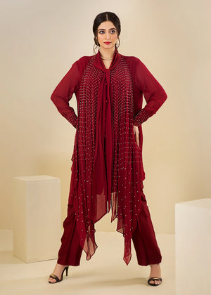 Description: Go all maroon this season with this two piece chiffon drapped shirt and pants with all hand embellishment.