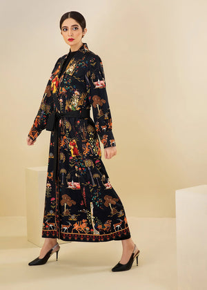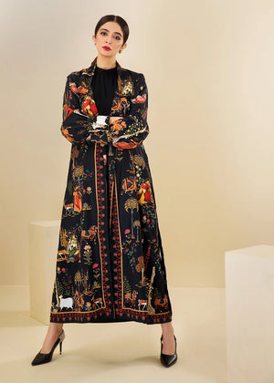 Mughal printed black trench jacket paired with a long undershirt. Crafted from heavy grip fabric for a stylish and distinctive look that is comfortable to wear all day.