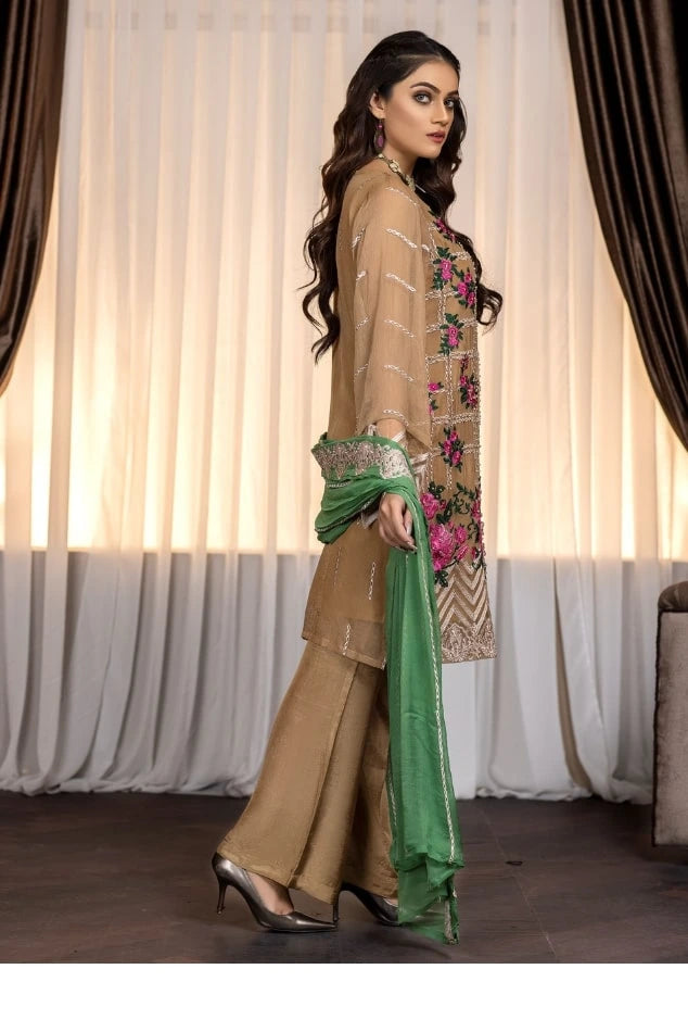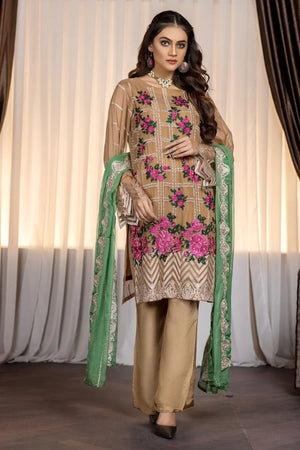 The classy handwork in off-white color covers the entire front of the shirt. This work is merged smartly with pink color flowers that you cannot resist the piece. The sleeves are also covered with off-white lines, whereas, the Russian grip trouser of this luxury pret collection is in brown matching color. The green contrasting dupatta enhances the look, which is also full of embroidery on the borders and in middle.