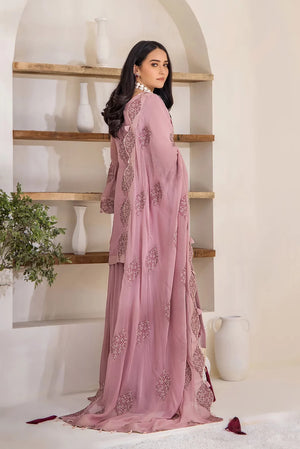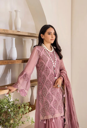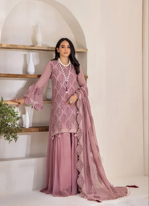 “Rajab” is enlivened with gorgeous and delicate tinny floral stitch work in shades of berry and golden tilla on dusky mauve canvas.’