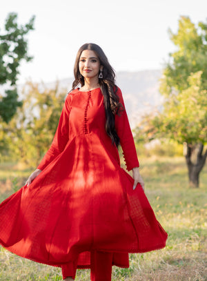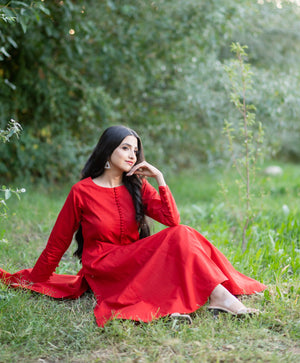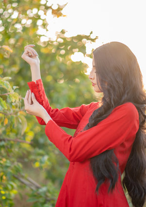 Make a statement of timeless elegance with our Scarlet Grace Ensemble (Rangrez), a stunning two-piece set designed to capture the essence of sophistication and allure. This vibrant red ensemble features a long shirt with the graceful flow of a frock and the sleek structure of a tunic. Intricate lace detailing along the hem adds a romantic touch, while handmade buttons on the front and long sleeves bring artisanal craftsmanship to this beautifully tailored piece.