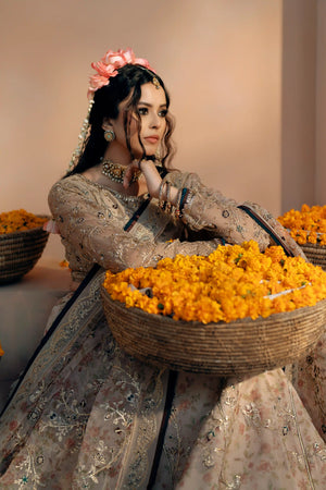 The choli is tailored to flatter, with delicate detailing that mirrors the lehenga’s artistry, while the coordinated net dupatta is lightly adorned with scattered tilla accents and a finely embroidered border, offering a light yet luxurious finish.