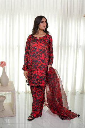 This beautifully crafted outfit features a printed dress with a classic neckline and straight sleeves, along with a flowing organza dupatta adorned with complementary print. Delicate tassels embellish the hem for a chic finish, and it is paired with a straight shalwar.