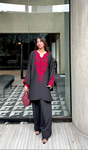Red On Black Embroidered Georgette Pret 2Pcs
