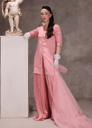 A dreamy peachy pink creation, this tussle silk ensemble is all about refined femininity. The short shirt is adorned with crystal embroidery and statement crystal bows on the sleeves, every woman’s favorite detail. Paired with extremely flared crush pants and a crystal trimmed organza dupatta, this three piece set combines crystals, bows, and delicate peach pink hues into the perfect fusion of a dream dress.