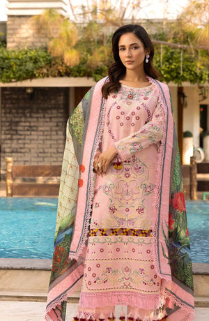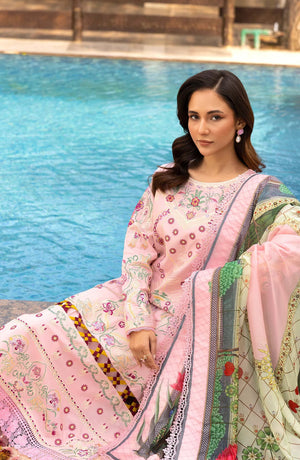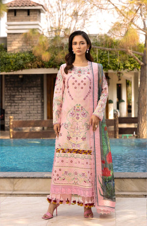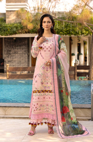 Experience the artistry of our pink embroidered lawn dress. The intricate embroidery on the center, right, and left panels creates a captivating design, enhanced by the elegant daman border. The luxurious silk dupatta adds a touch of ethereal beauty, while the comfortable cotton trousers ensure effortless style. Perfect for both casual gatherings and special occasions.