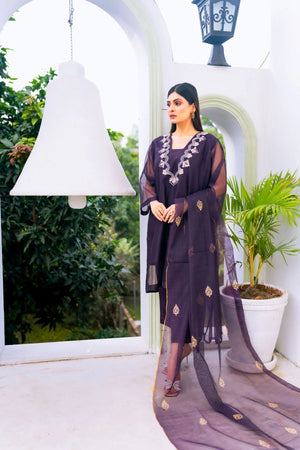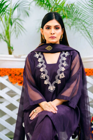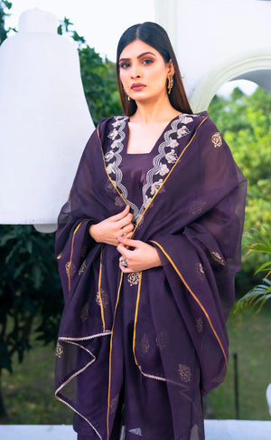 - Step into the enchanting aura of the “Royal Orchid” – a symphony of classic grace and contemporary allure. This three-piece wonder embodies the fusion of timelessness and modernity in a straight-cut silhouette, wrapped in exquisite Cotton Net fabric adorned with intricate 3D mashed gotti embellishments and delicate tilla work, evoking a mesmerizing charm.The Cotton Net Dupatta, reminiscent of a fairy-tale garden, showcases delicate, fern-like foliage in Gold Hand Block Printing, a testament to ethereal elegance. Its lace embellishment adds an extra layer of allure. The Cotton Silk slip and shirt harmonize seamlessly, while the Viscos Silk trousers, available in both straight and capri styles, embody comfort and sophistication.