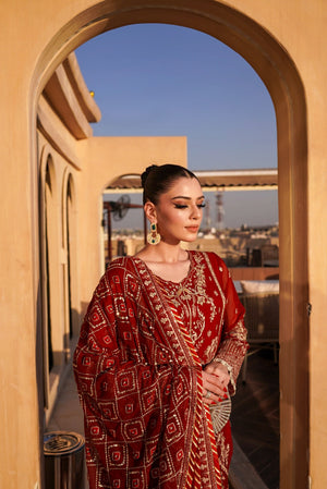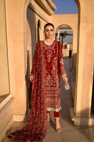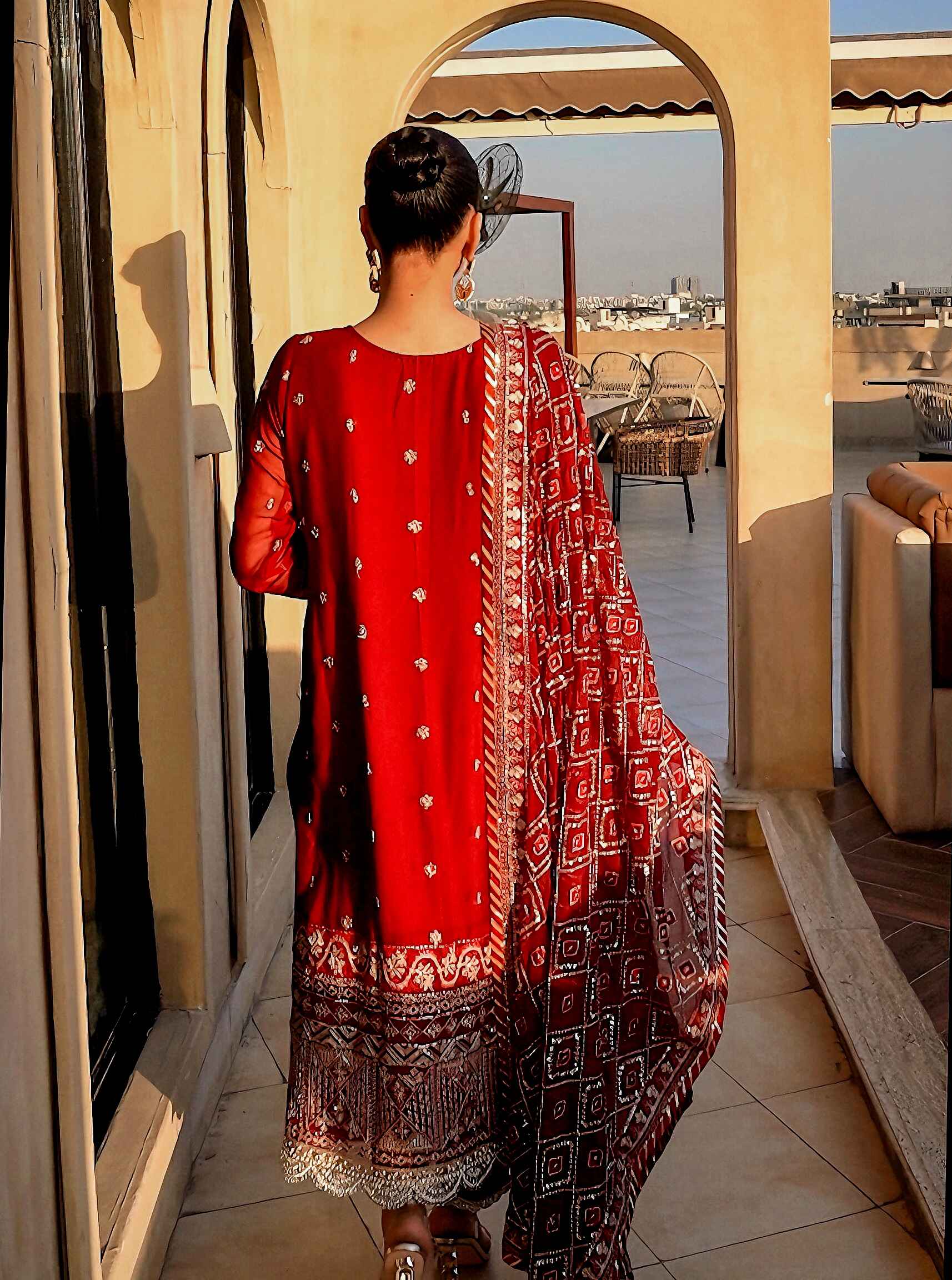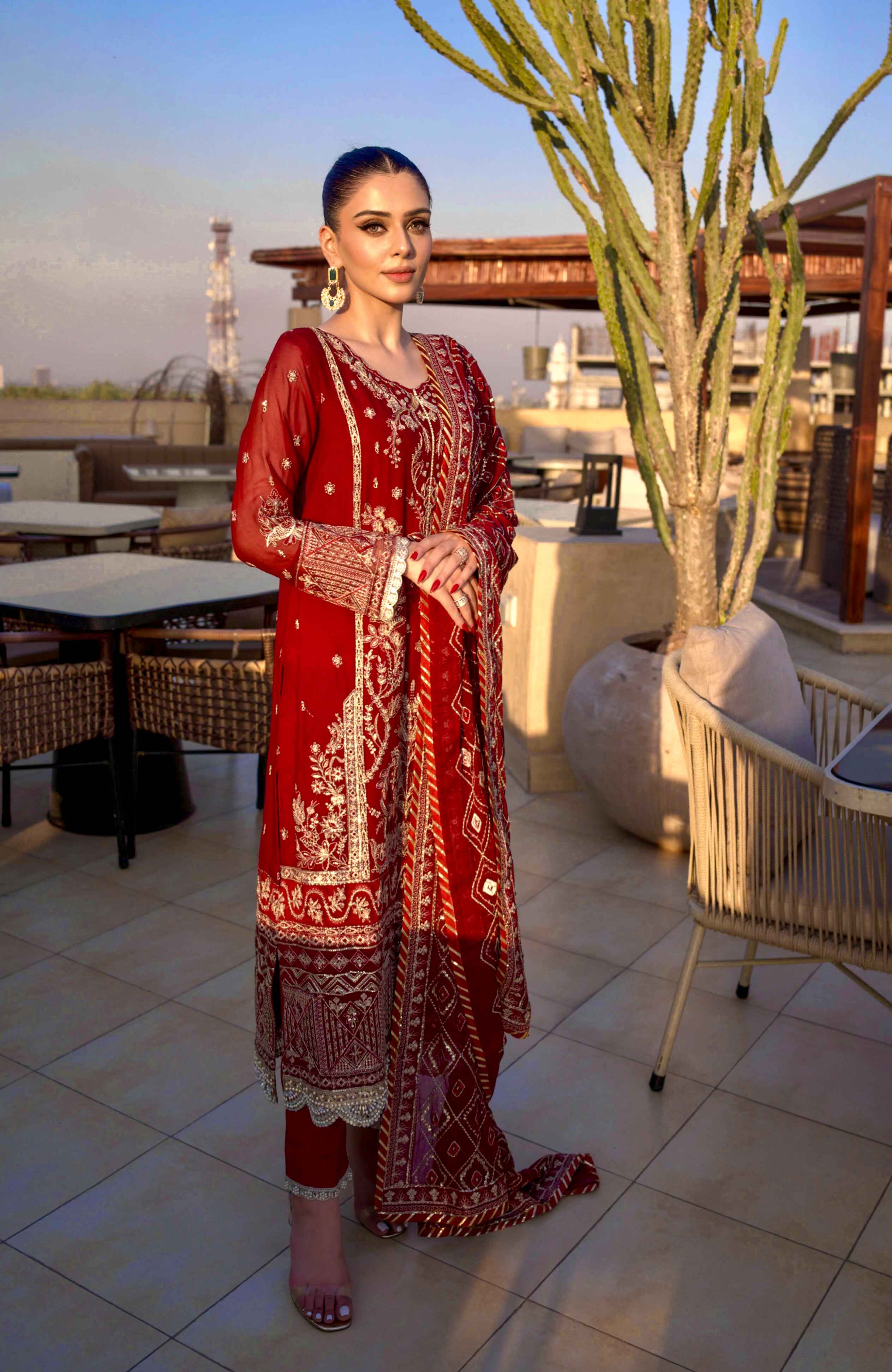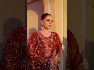 Additional Description: Chiffon Center panel, Chiffon right and Left Panel, chiffon embroidered back, chiffon embroidered sleeves, chiffon embroidered dupatta, organza embroidered front and back border 1&2, organza embroidered four side dupatta border, organza embroidered sleeves border. Rawsilk trouser and Inner. Embroidered Tilla and sequin work with lace/embellishments.