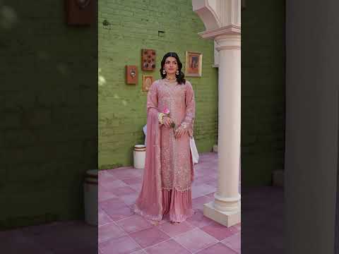 Elegance personified! This exquisite straight-cut shirt is crafted from embroidered chiffon and features fully adda work on the whole shirt. The sleeves are adorned with beautiful embroidery and an embroidered organza border at the opening. Complete with an embroidered chiffon dupatta featuring an embroidered silk border, and paired with a raw silk crush sharara, this ensemble is perfect for making a statement at any occasion. A stunning addition to your formal wardrobe, guaranteed to turn heads