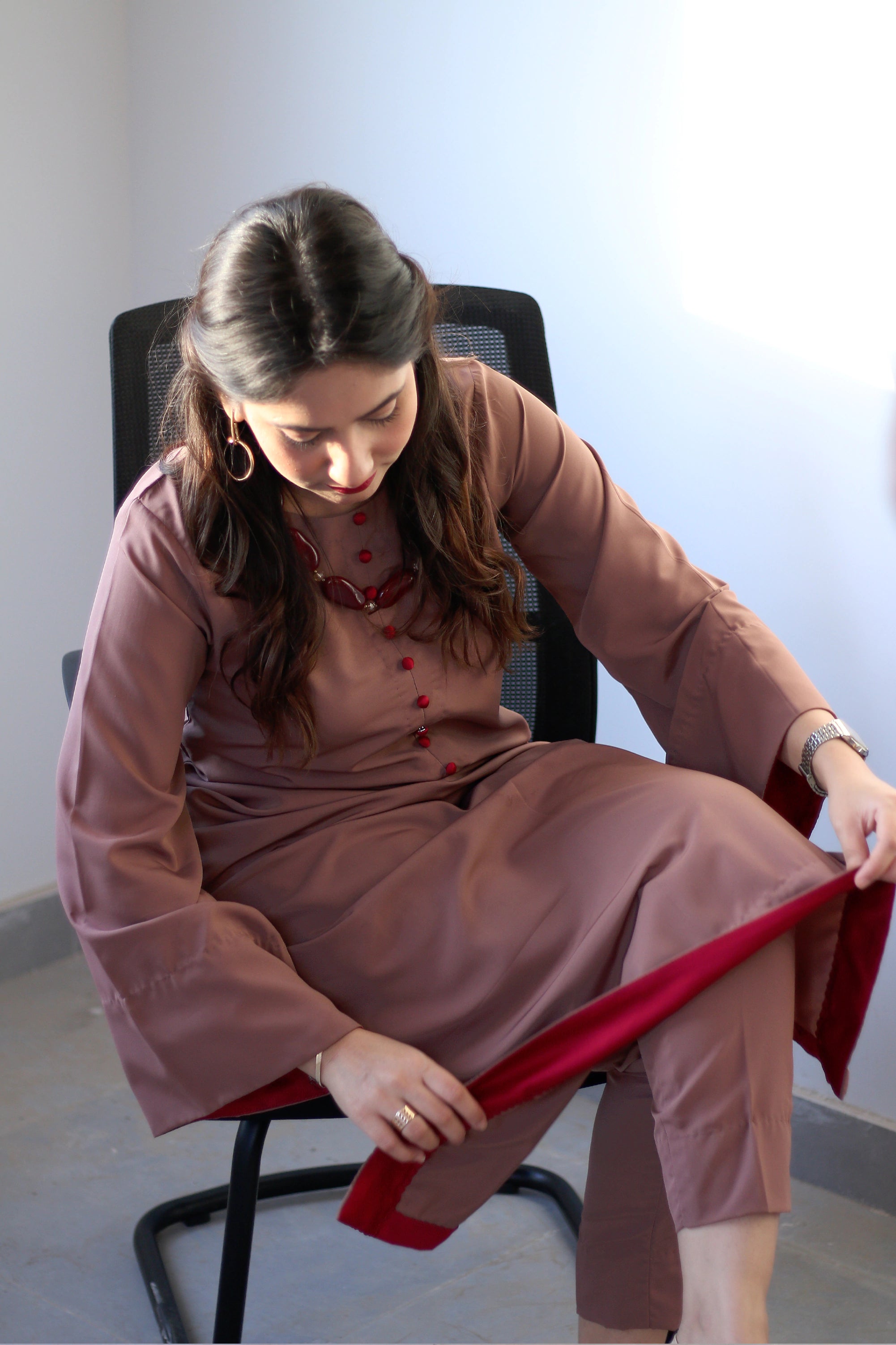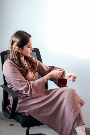 It's a two piece matching set includes long airline shirt with the paltawa of maroon silk fabric along with straight pant.