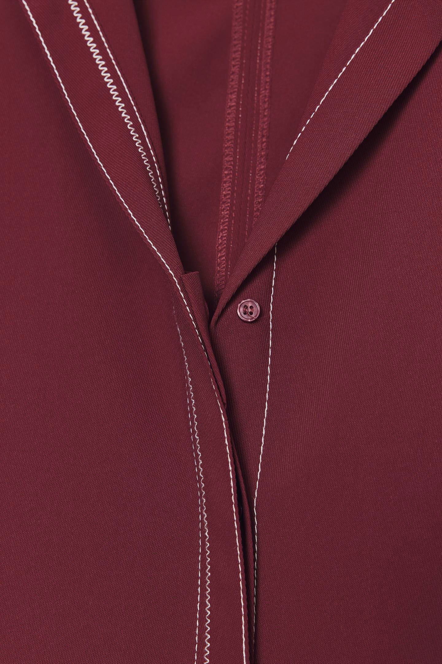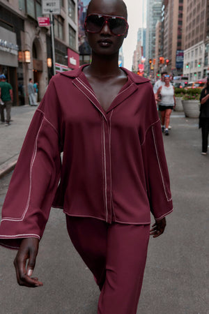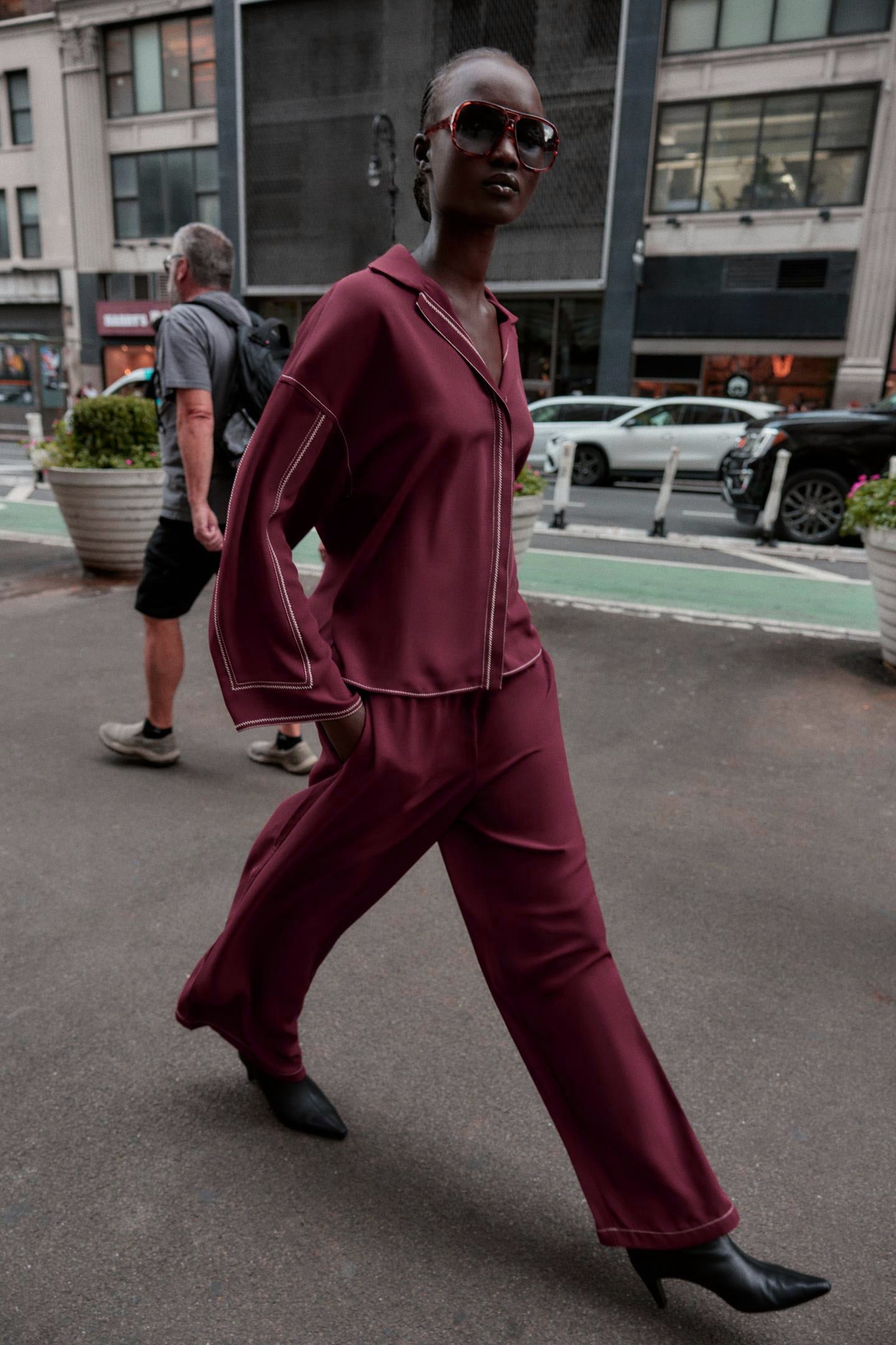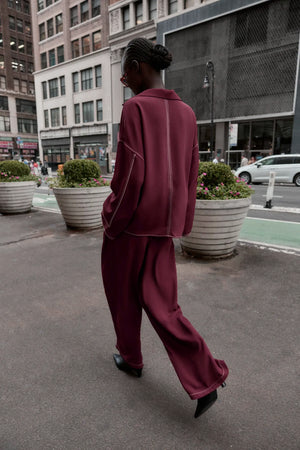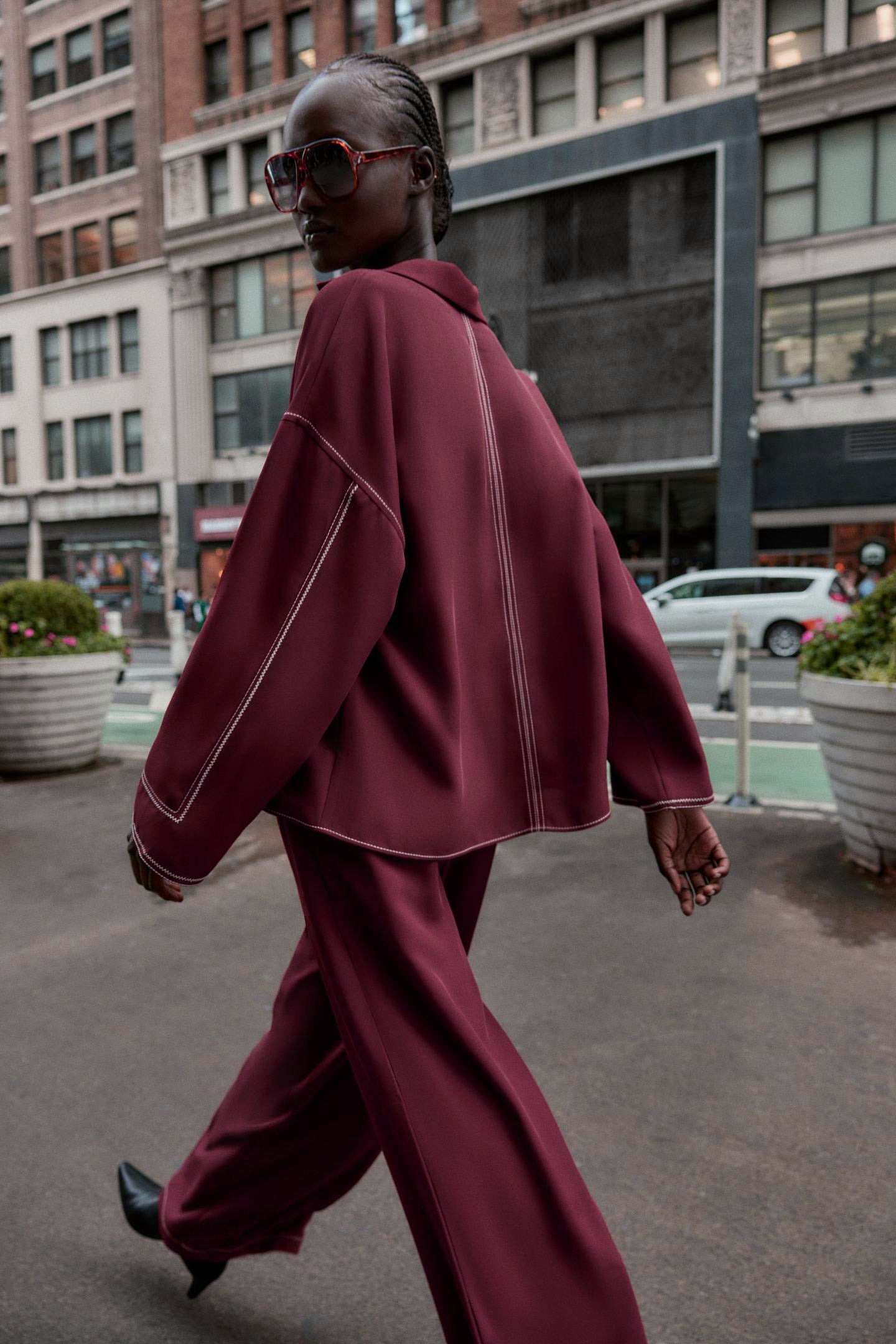 The set is elegantly detailed with contrast embroidered piping along the collar, placket, cuffs, and trouser seams, adding a chic, structured finish. This versatile suit offers an effortless drape and is perfect for elevated street style or a polished evening out. 🍂✨