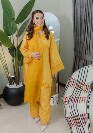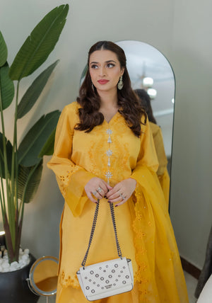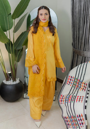 This mustard 3-piece embroidered silk dress is a striking fusion of elegance and tradition. Made from luxurious silk, the ensemble features a richly embroidered shirt that showcases intricate patterns and fine craftsmanship. The warm mustard tone adds vibrance and depth, making it a standout choice for festive occasions and cultural events. Paired with coordinating silk trousers and a beautifully detailed dupatta, the outfit offers both comfort and sophistication. Perfect for weddings, formal dinners, or festive gatherings, this dress is designed to make a lasting impression with its bold color and graceful detailing.