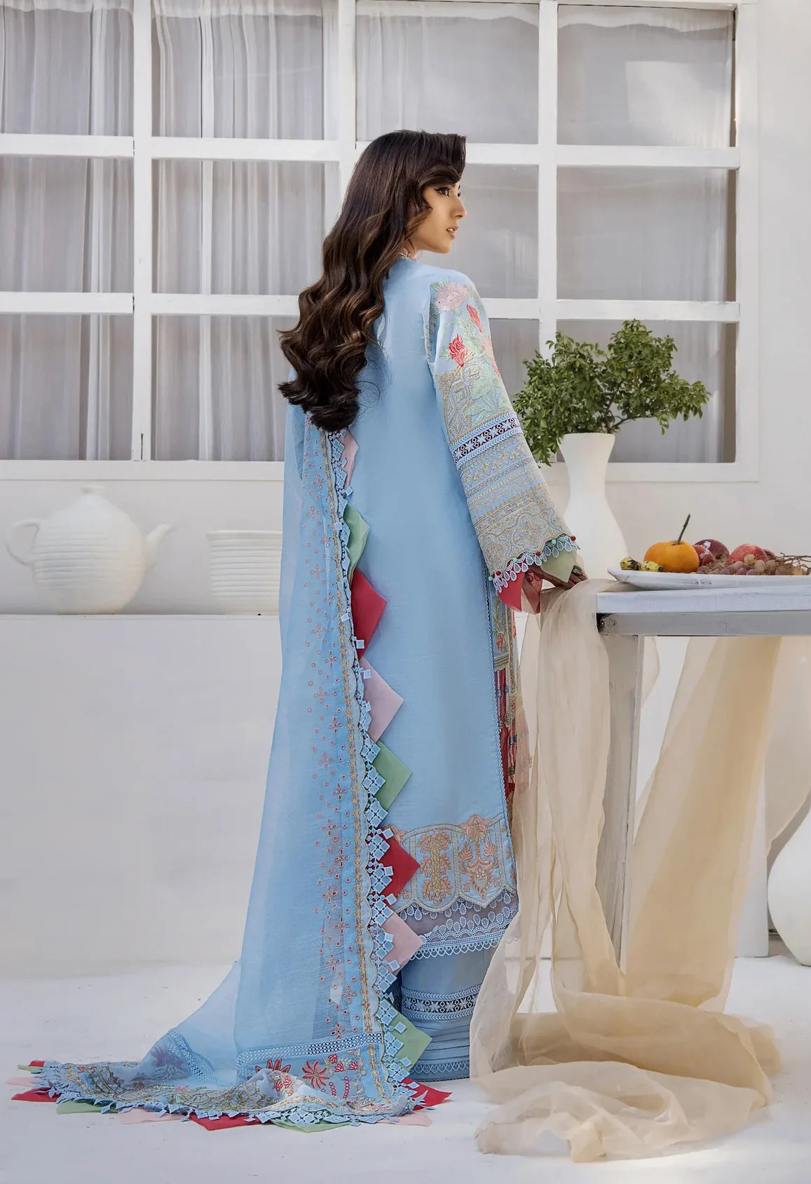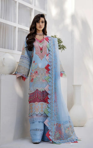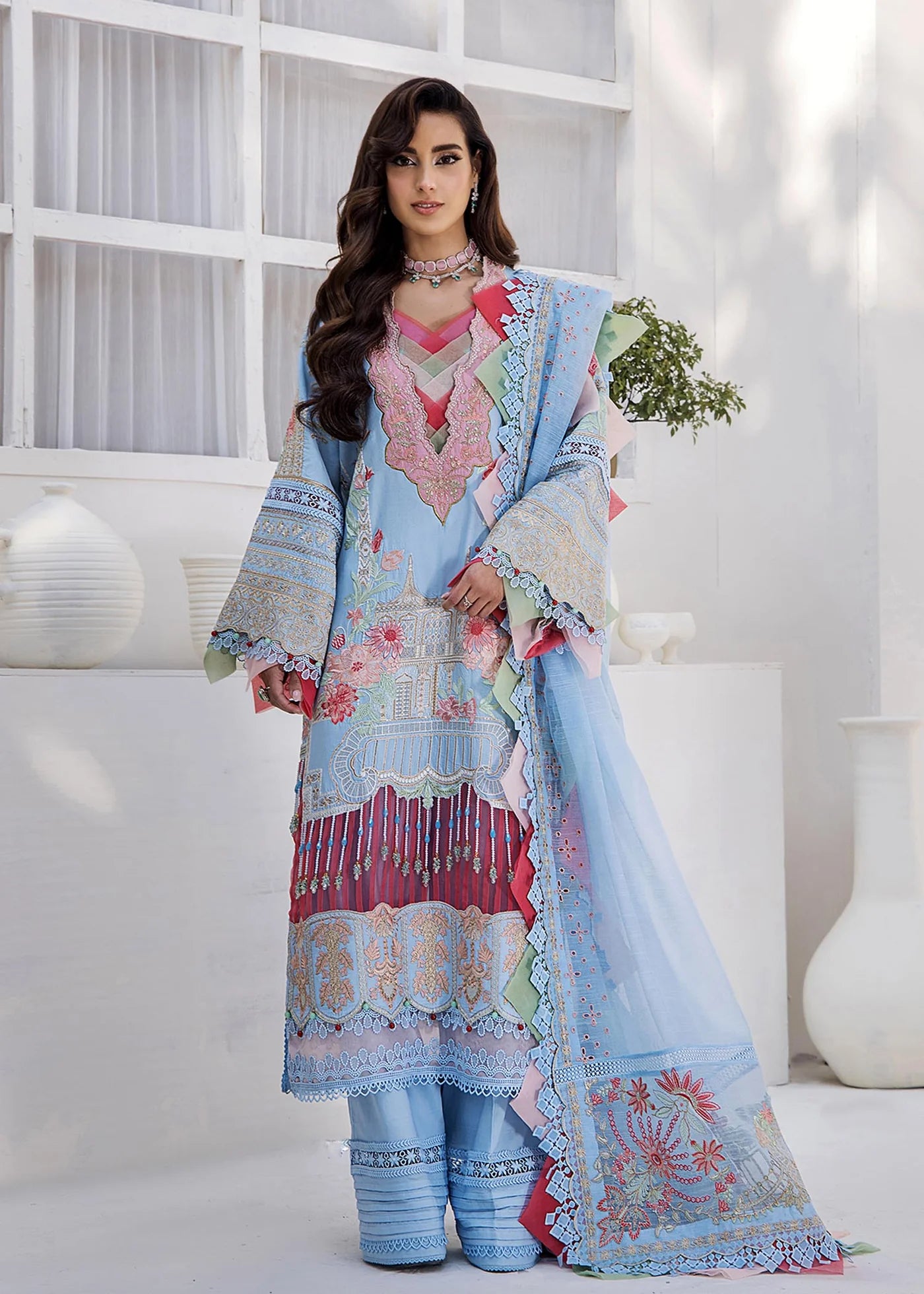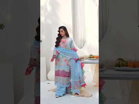 - Embrace the vastness of the desert with a touch of unexpected beauty in “Sakura Skyline.” This fabric drapes like a cool desert sky, with embroidered front and neckline patch rendered in a calming shade of sky blue. Imagine a embroidered woven net dupatta flowing crafted from this material, it’s colour echoing the endless expanse above the dunes, adding a touch of unexpected femininity. Let “Sakura Skyline” inspire a garment that embodies the desert’s serenity and the resilience of life that thrives there.