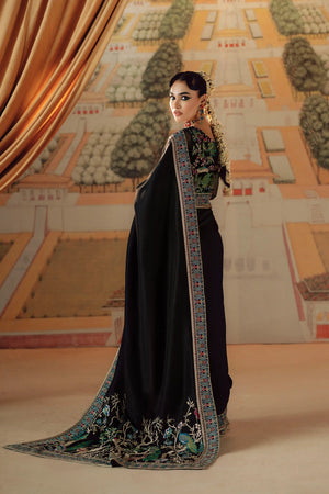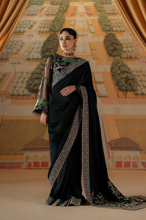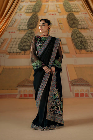 This elegant ensemble features an exquisite black PK silk saree paired with a beautifully embellished blouse. The saree's luxurious black hue drapes gracefully, exuding sophistication and timeless charm. The blouse is intricately adorned with delicate embroidery, featuring shimmering beads, sequins, and intricate threadwork that catch the light with every movement. The combination of the opulent, lustrous fabric of the saree and the detailed embellishments on the blouse creates a striking contrast, elevating the entire look. Perfect for a formal evening, wedding, or any special occasion, this outfit radiates glamour, tradition, and modern elegance.