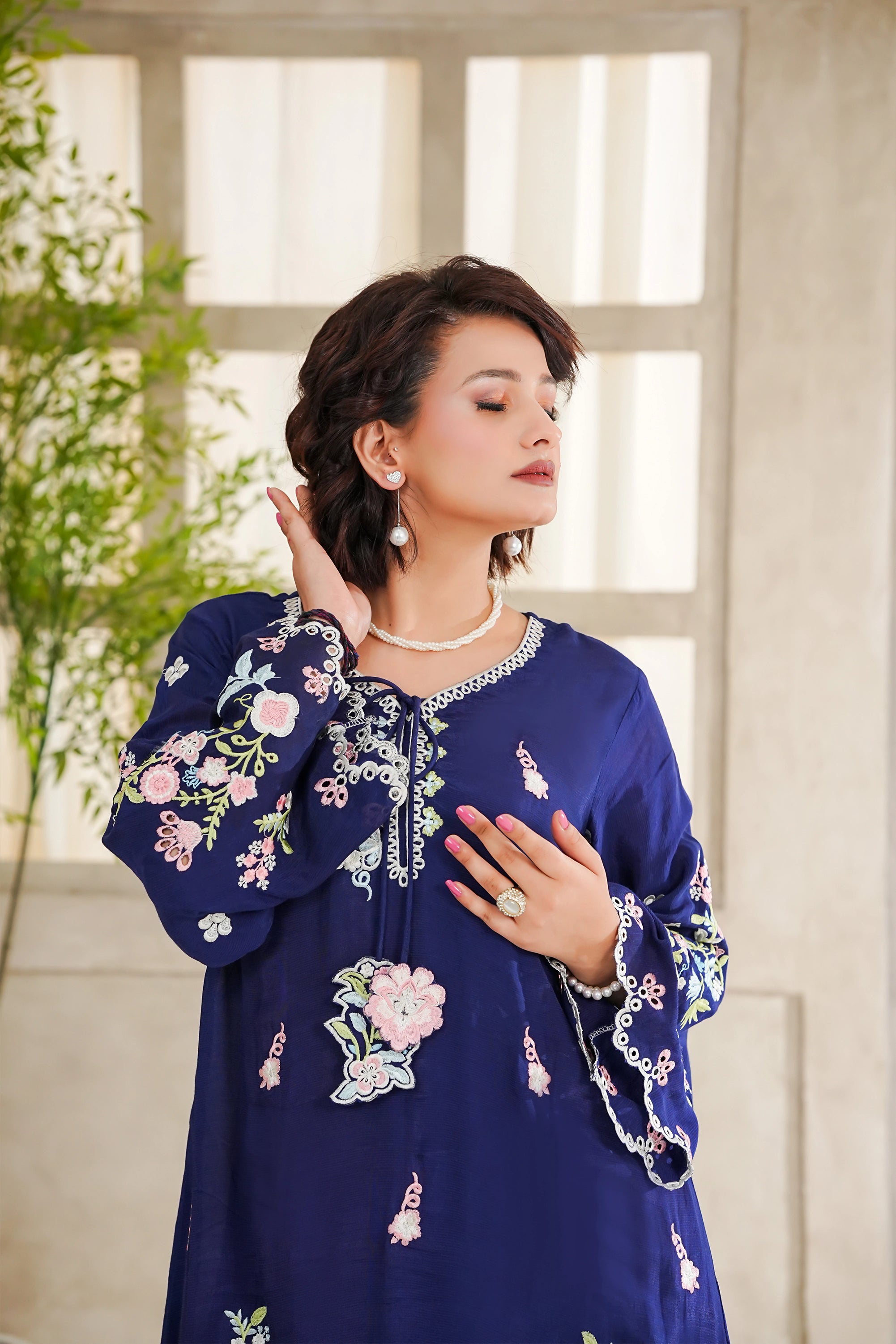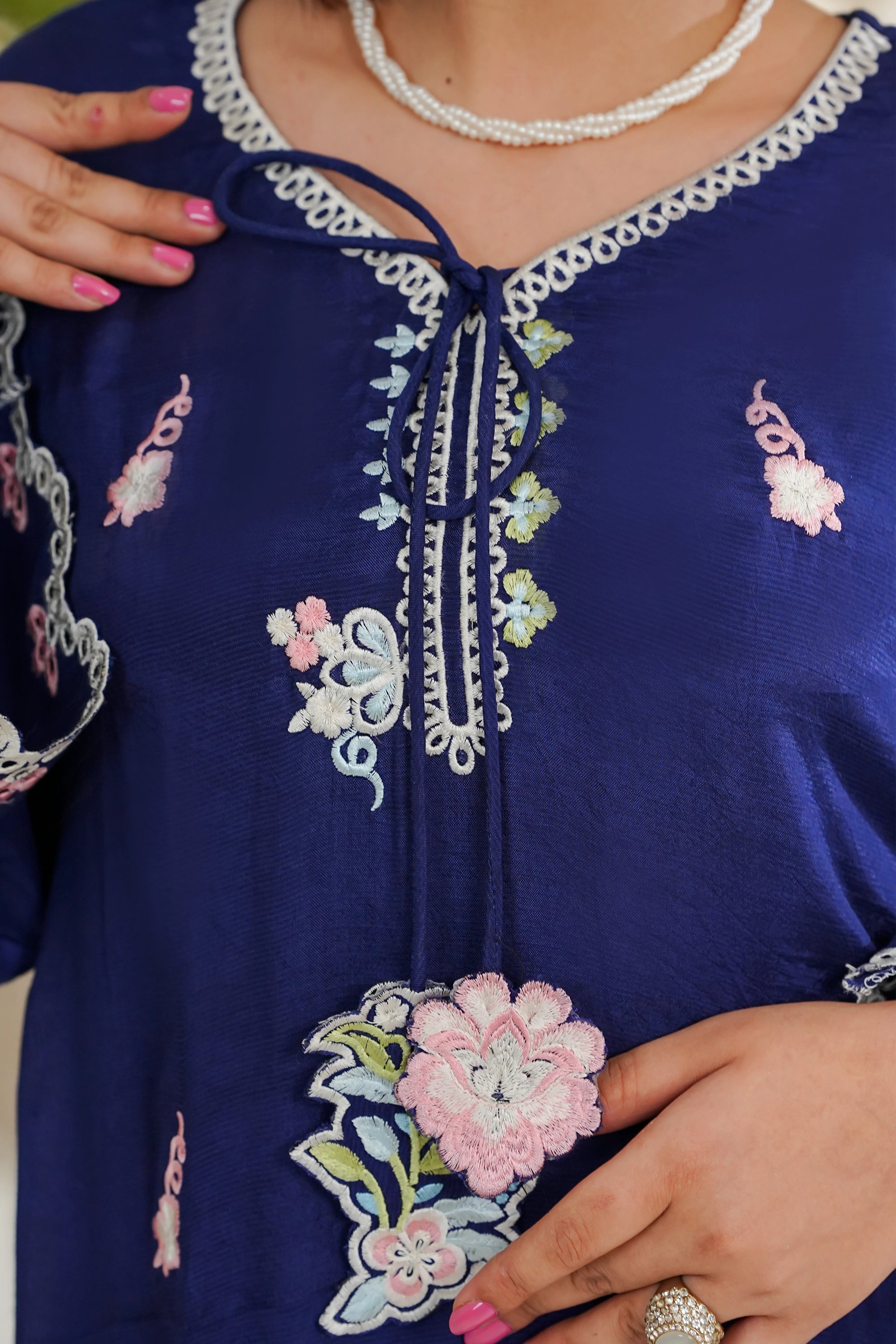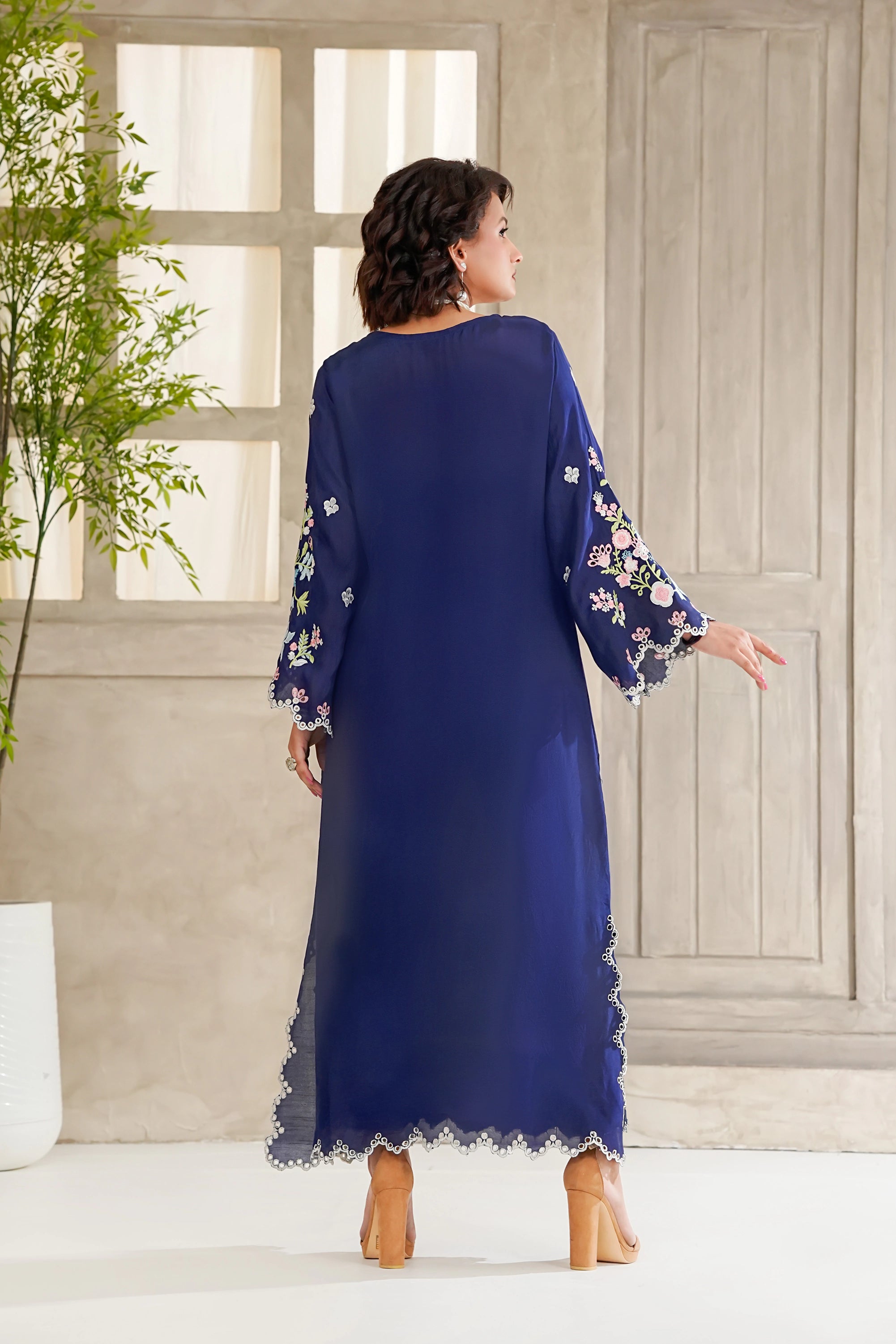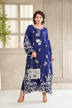 A serene and graceful two-piece Suit set in a rich royal blue. This piece features delicate, light-hued floral and vine embroidery in soft pinks, blues, and whites, lending a gentle, romantic air. The long-sleeved kaftan drapes beautifully, highlighted by the intricate work around the neckline and border. Paired with elegant coordinating with capri style trousers, it offers an effortlessly chic style for any occasion.