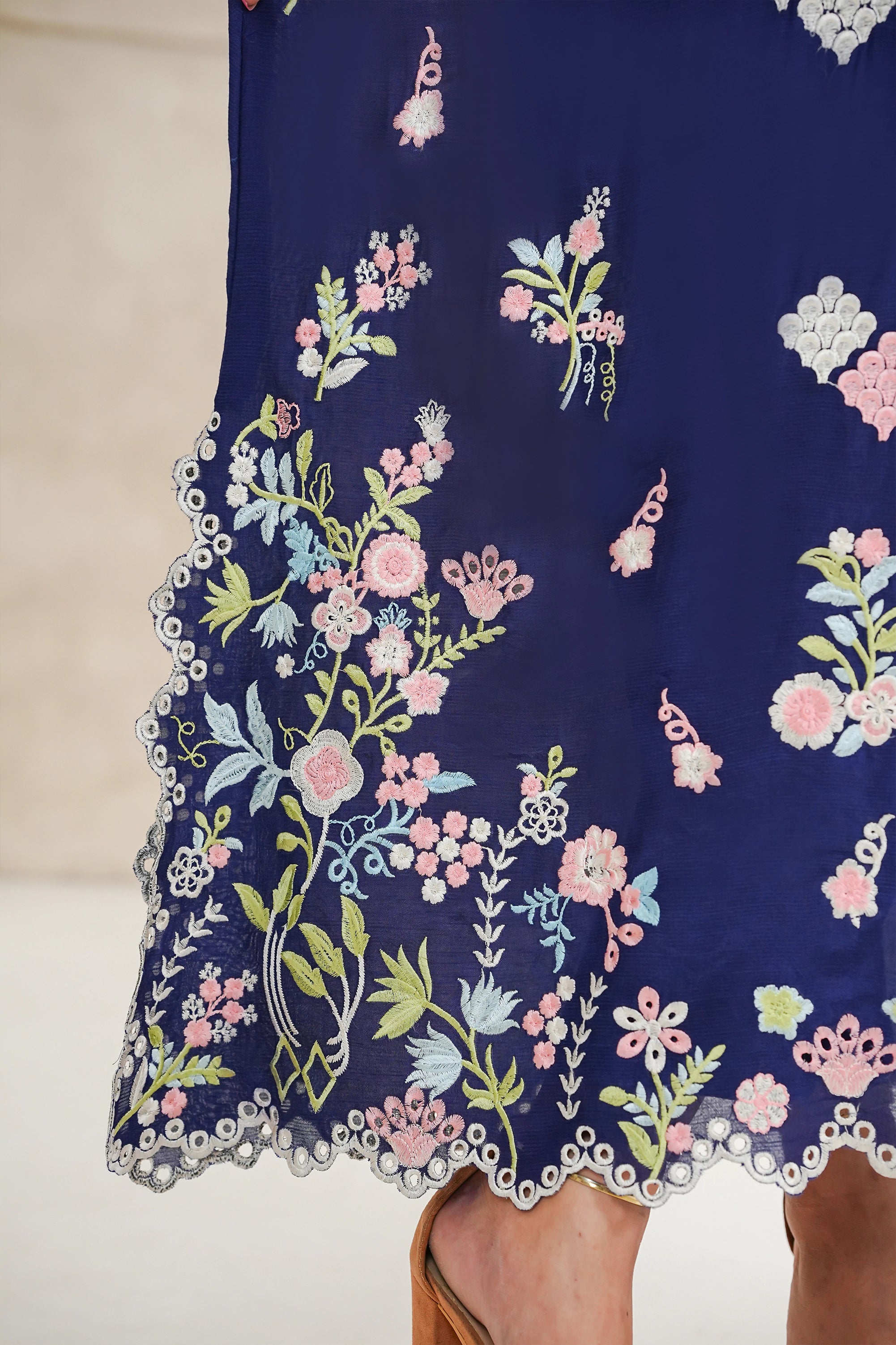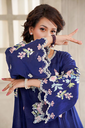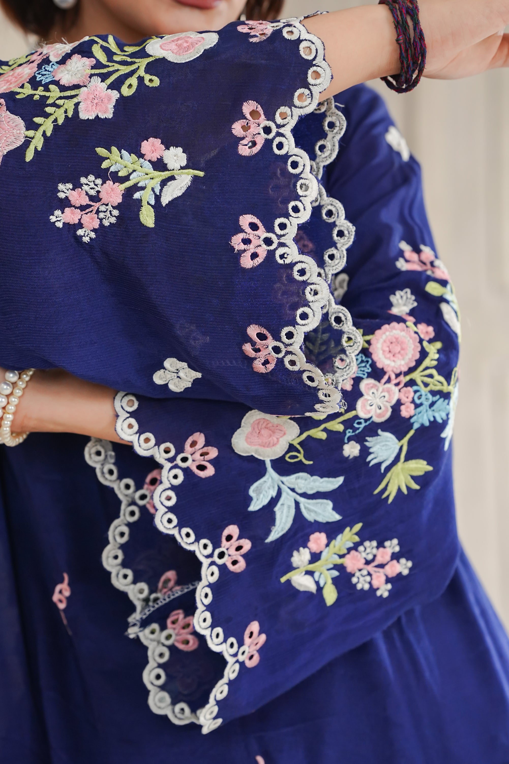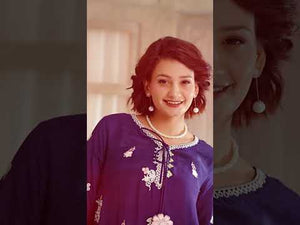 A serene and graceful two-piece Suit set in a rich royal blue. This piece features delicate, light-hued floral and vine embroidery in soft pinks, blues, and whites, lending a gentle, romantic air. The long-sleeved kaftan drapes beautifully, highlighted by the intricate work around the neckline and border. Paired with elegant coordinating with capri style trousers, it offers an effortlessly chic style for any occasion.