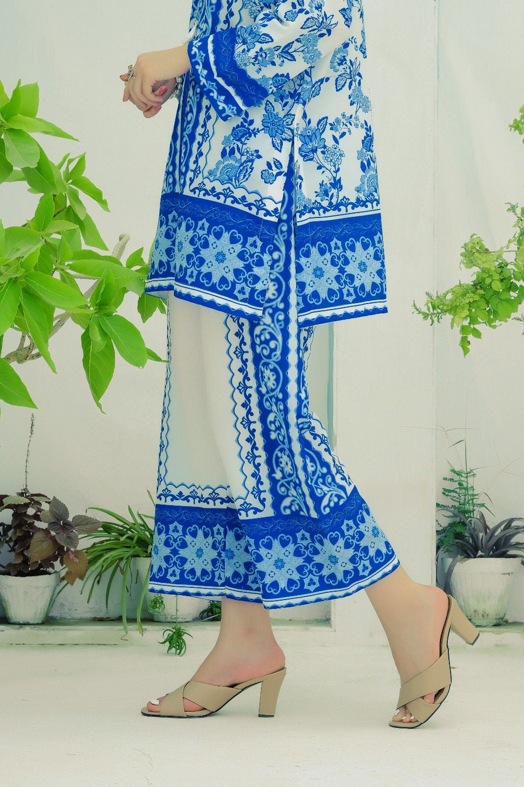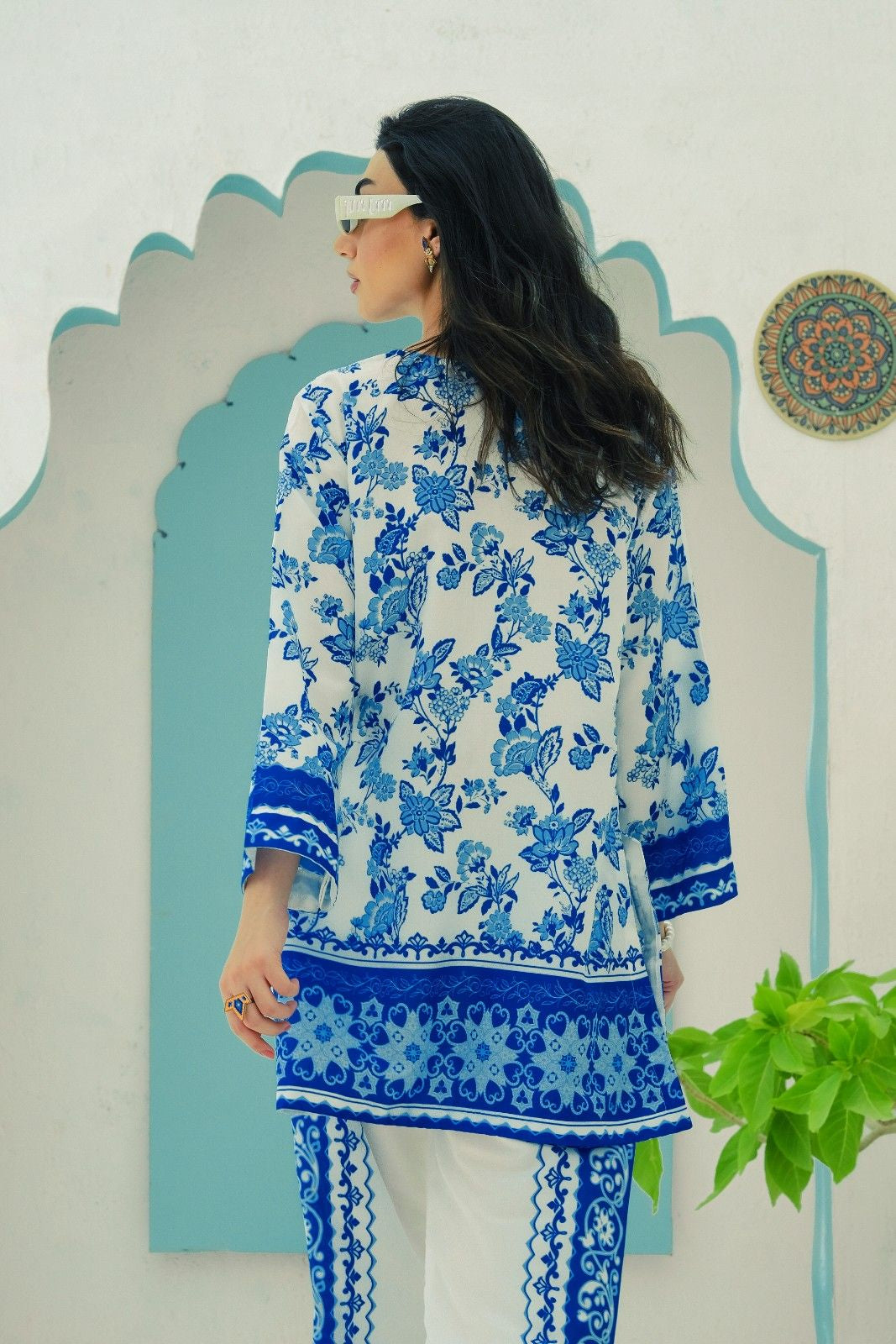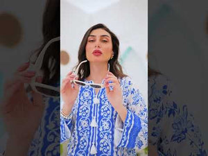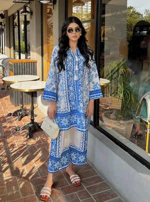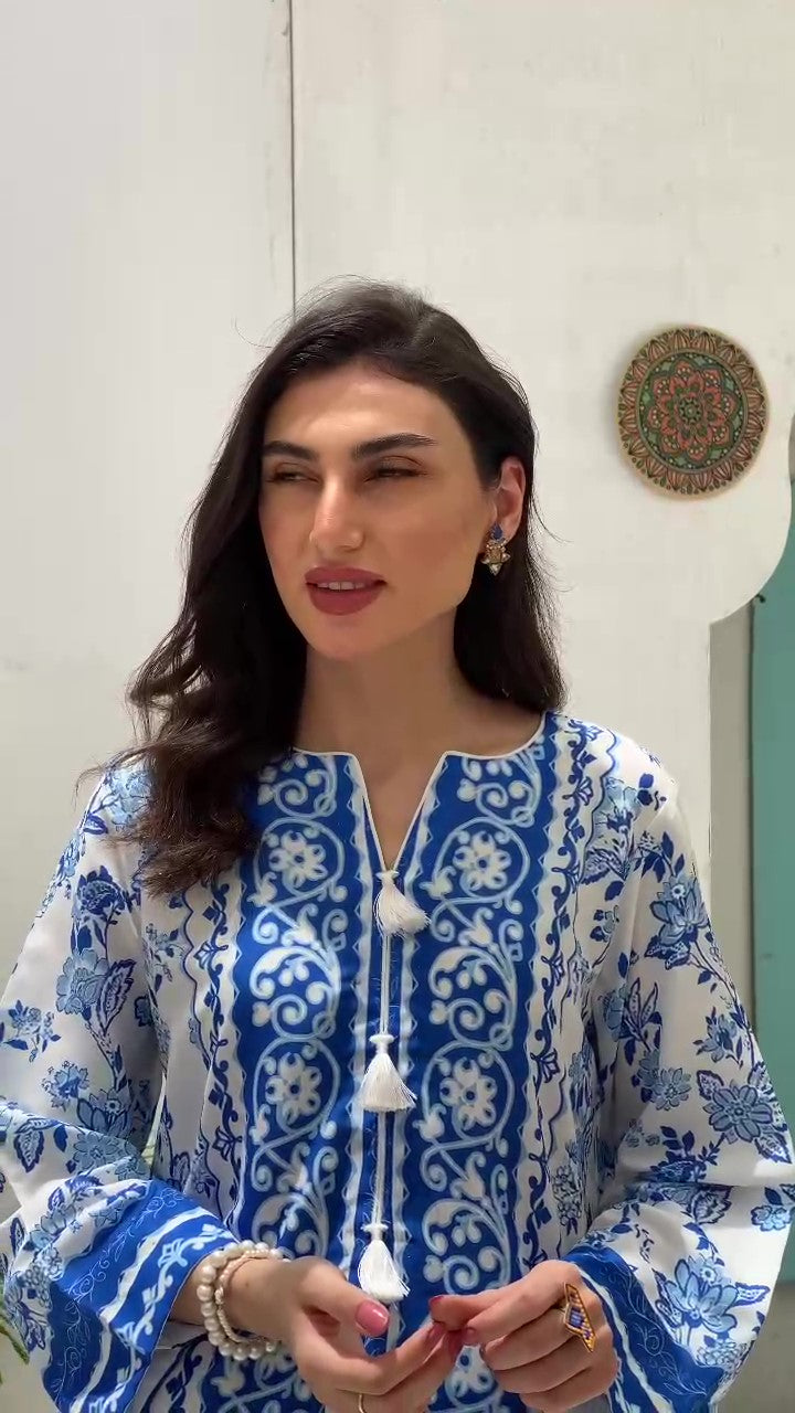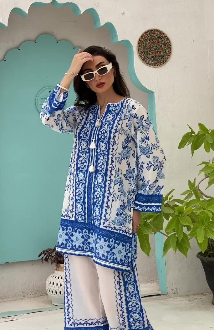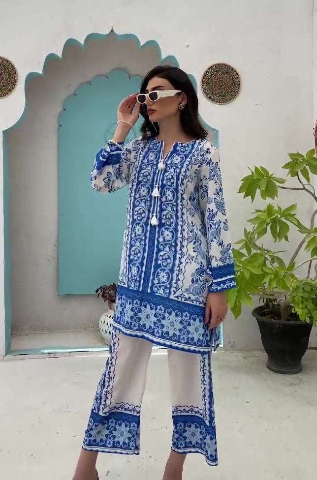 - A co-ord Set that is a stunning blend of sophistication and vibrancy. Crafted from cotton silk, this exquisite ensemble features a captivating blue shirt adorned with energetic, colorful prints that exude elegance and charm. Paired with modern style white base trouser, highlighted by intricately printed borders, this set effortlessly combines traditional grace with modern flair. Perfect for any occasion, the Sapphire Majestic set promises to make a striking statement, blending contemporary style with timeless beauty. Elevate your wardrobe with this magnificent co-ord set and embrace the essence of refined fashion.
