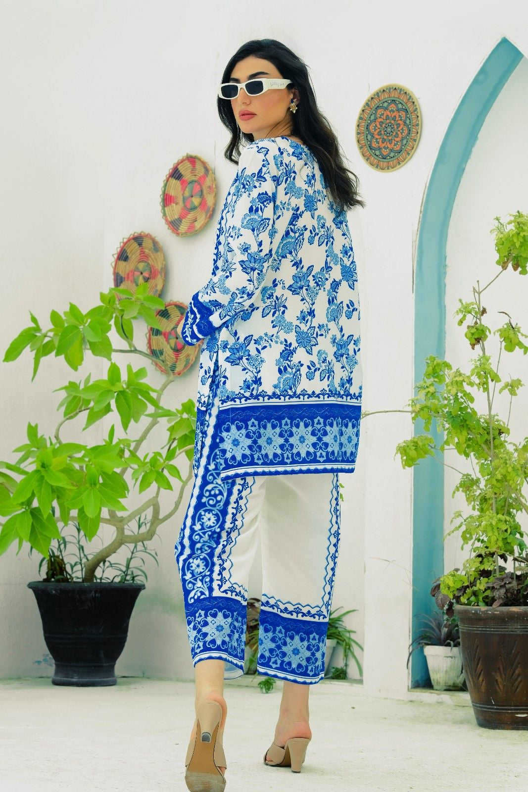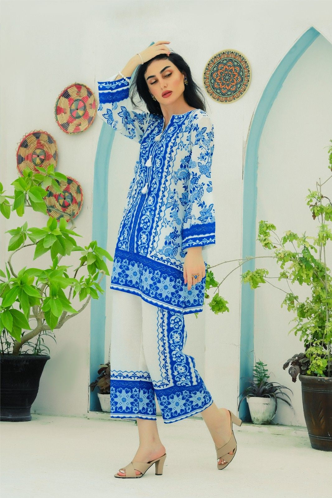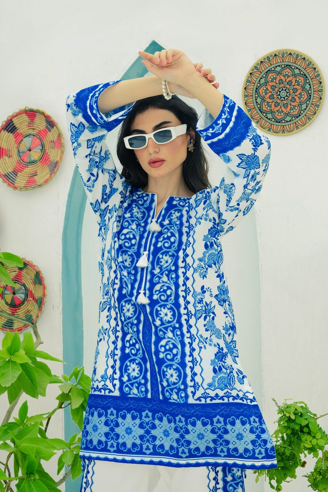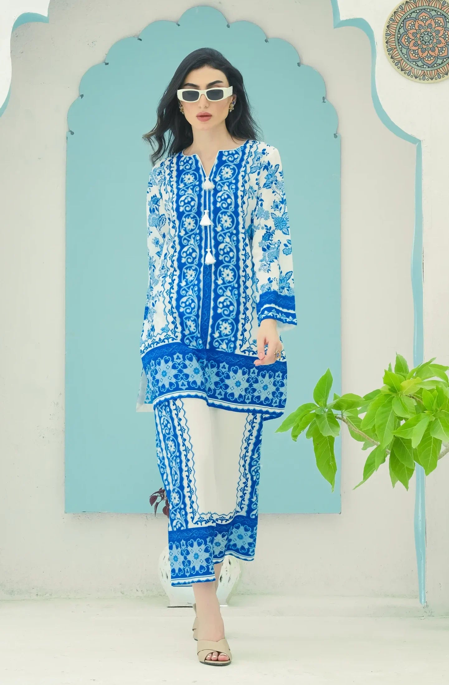 - A co-ord Set that is a stunning blend of sophistication and vibrancy. Crafted from cotton silk, this exquisite ensemble features a captivating blue shirt adorned with energetic, colorful prints that exude elegance and charm. Paired with modern style white base trouser, highlighted by intricately printed borders, this set effortlessly combines traditional grace with modern flair. Perfect for any occasion, the Sapphire Majestic set promises to make a striking statement, blending contemporary style with timeless beauty. Elevate your wardrobe with this magnificent co-ord set and embrace the essence of refined fashion.