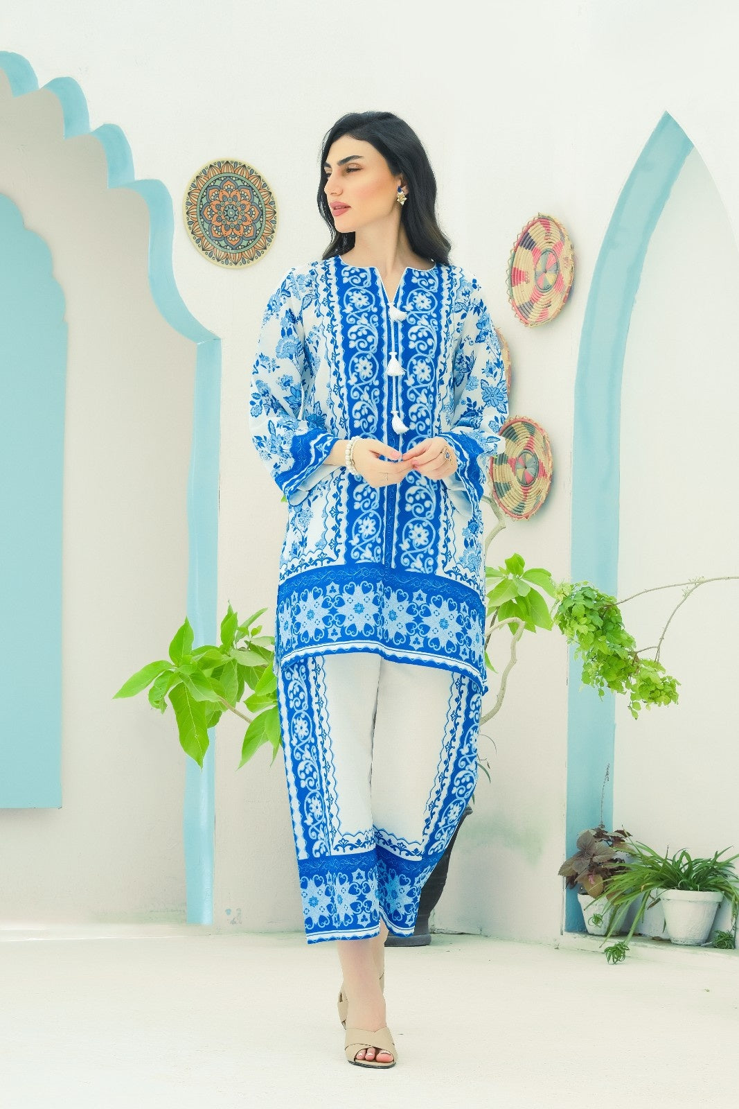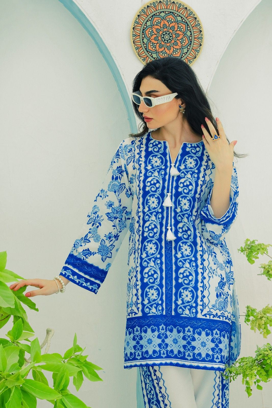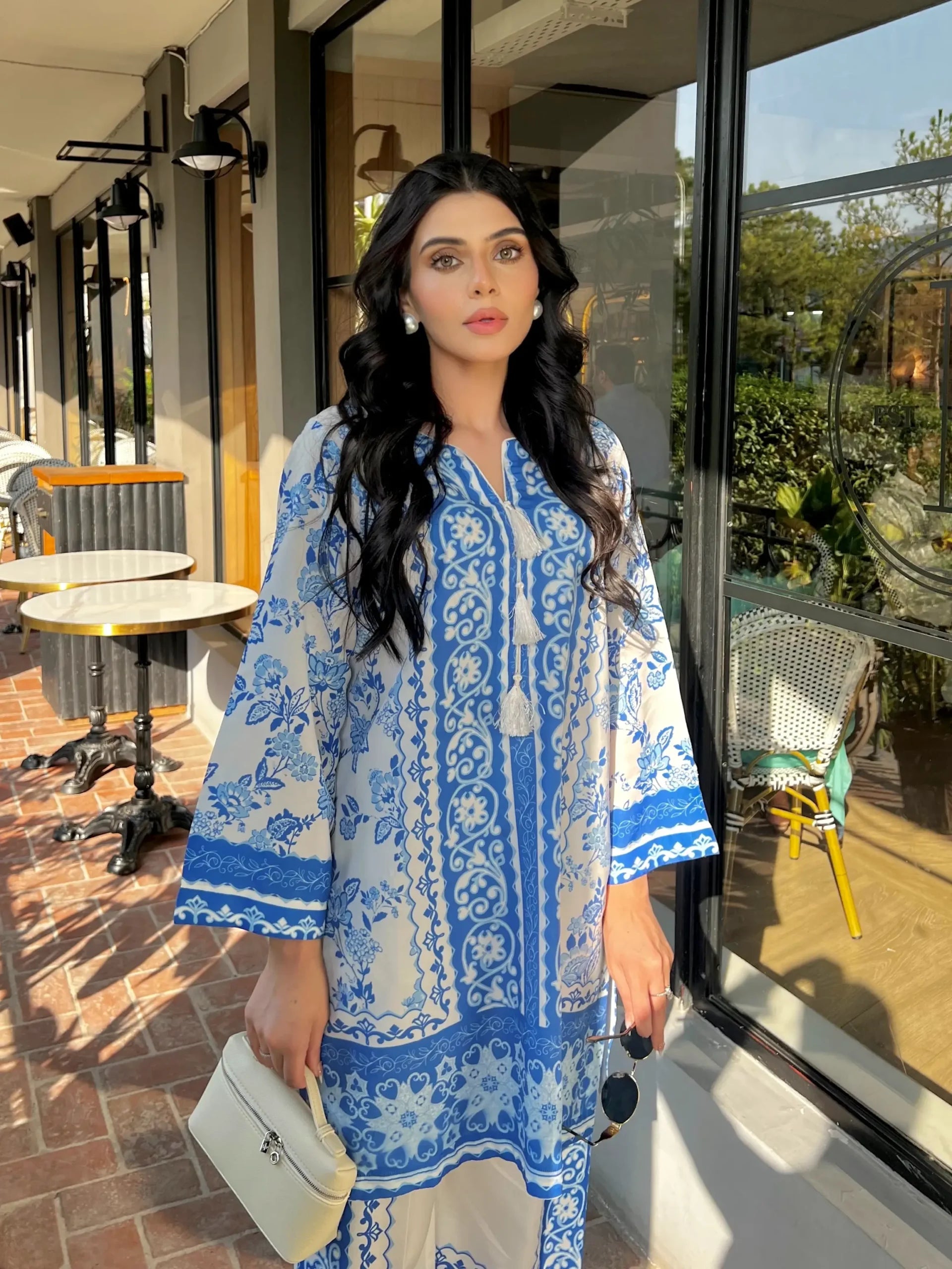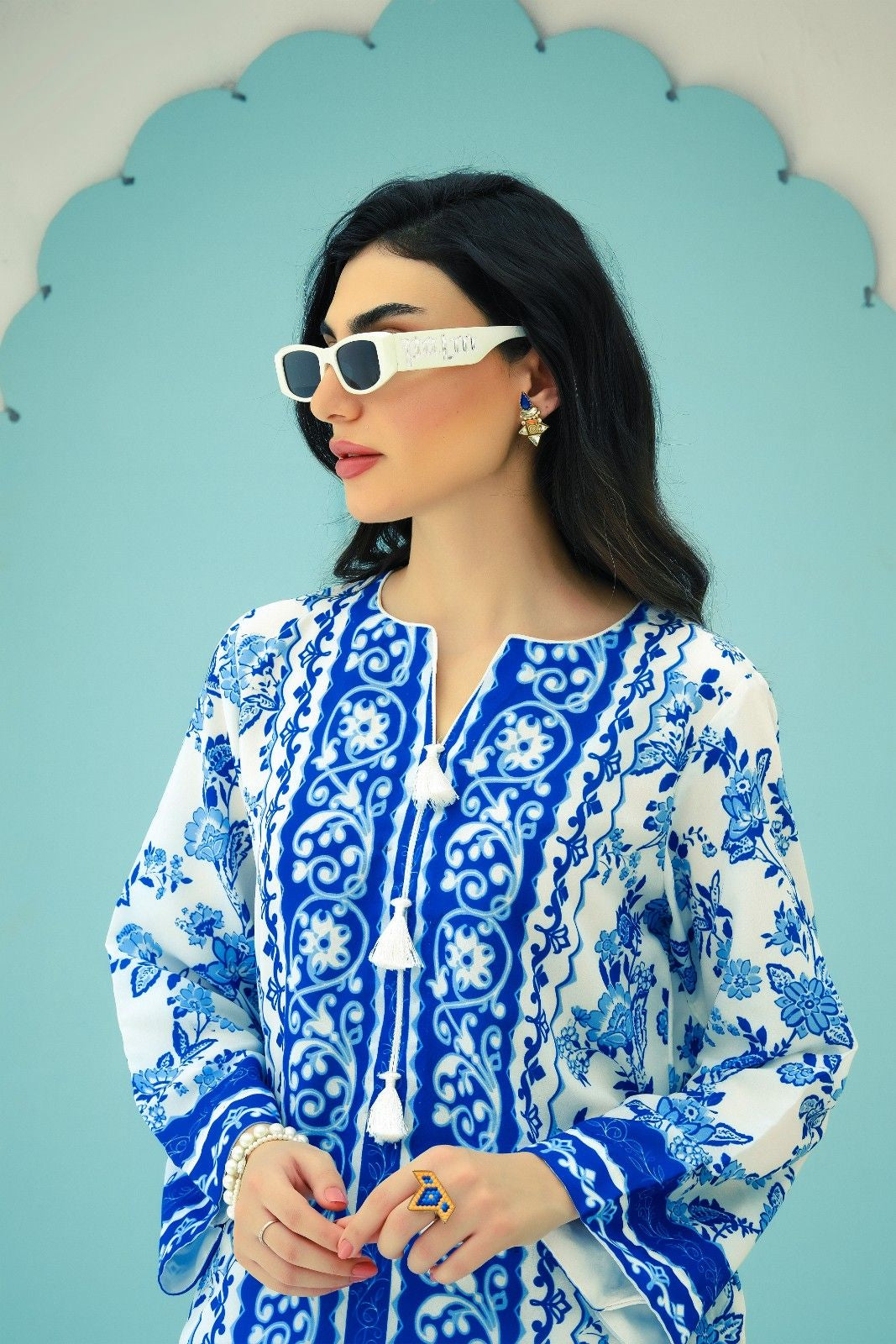 - A co-ord Set that is a stunning blend of sophistication and vibrancy. Crafted from cotton silk, this exquisite ensemble features a captivating blue shirt adorned with energetic, colorful prints that exude elegance and charm. Paired with modern style white base trouser, highlighted by intricately printed borders, this set effortlessly combines traditional grace with modern flair. Perfect for any occasion, the Sapphire Majestic set promises to make a striking statement, blending contemporary style with timeless beauty. Elevate your wardrobe with this magnificent co-ord set and embrace the essence of refined fashion.