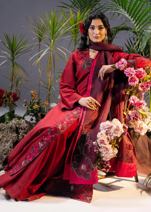 Step into elegance with this stunning viscose angrakha, adorned with intricate embroidery and adda work, complemented by a beautiful rose detail on the neckline. Complete the look with a luxurious Maroon organza dupatta and chic PK raw flayered pants.