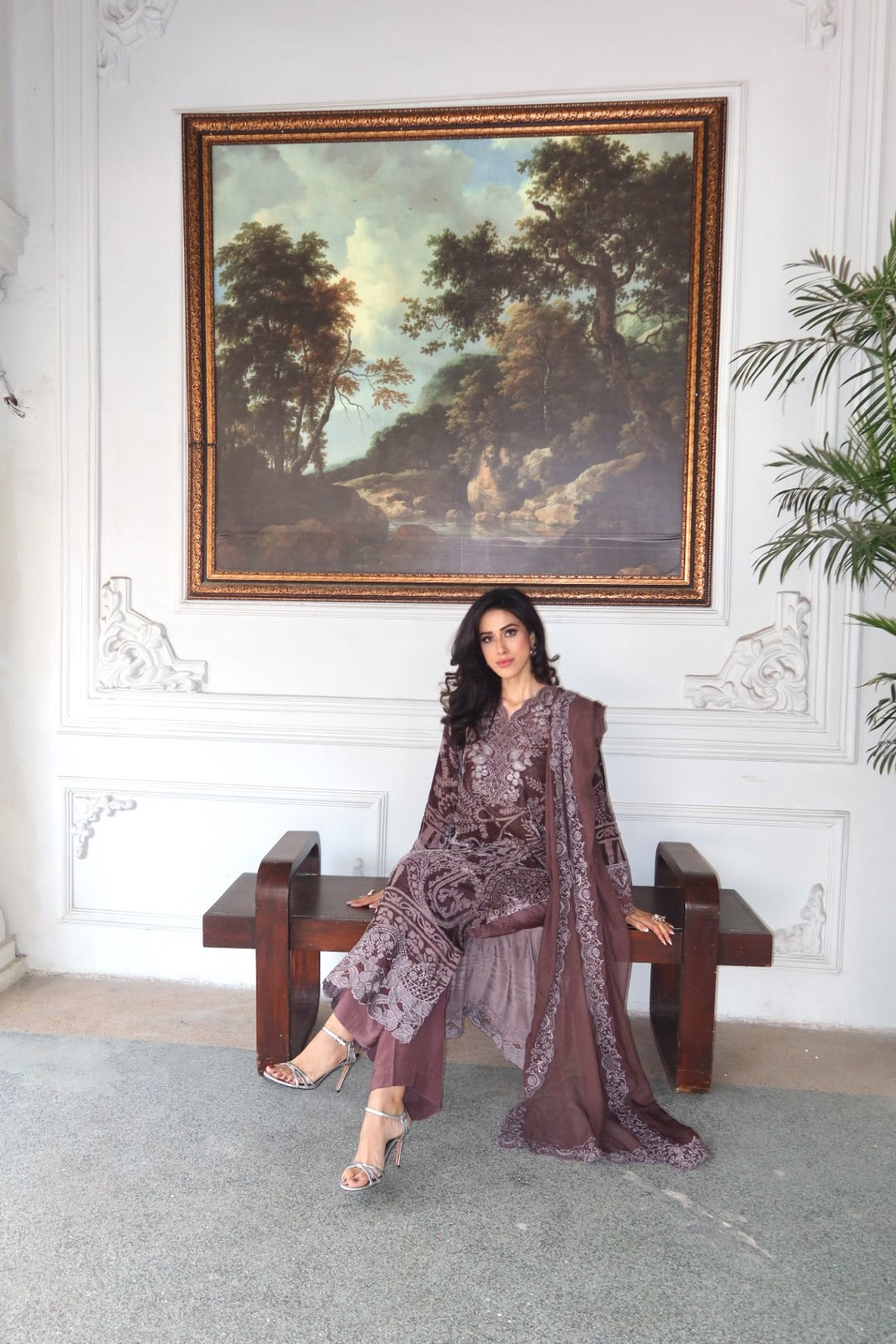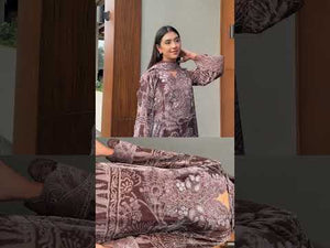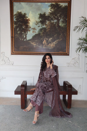 The Sepia Muse is an exquisite three-piece ensemble, blending warm, luxurious fabrics with delicate embroidery. The straight-cut shirt is crafted from plush Velvet in a beautiful taupe or sepia brown shade, featuring an all-over patterned design. The shirt is richly detailed with sequence embroidery accenting the neckline and the daman (hem) border, which is elegantly finished with detailed cut work. This sophisticated piece is paired with comfortable wide-leg trousers made from complementary Raw Silk. Completing the look is a flowing Chiffon Dupatta, which drapes gracefully and is bordered with intricate embroidery, making this outfit perfect for formal evening events.🍂