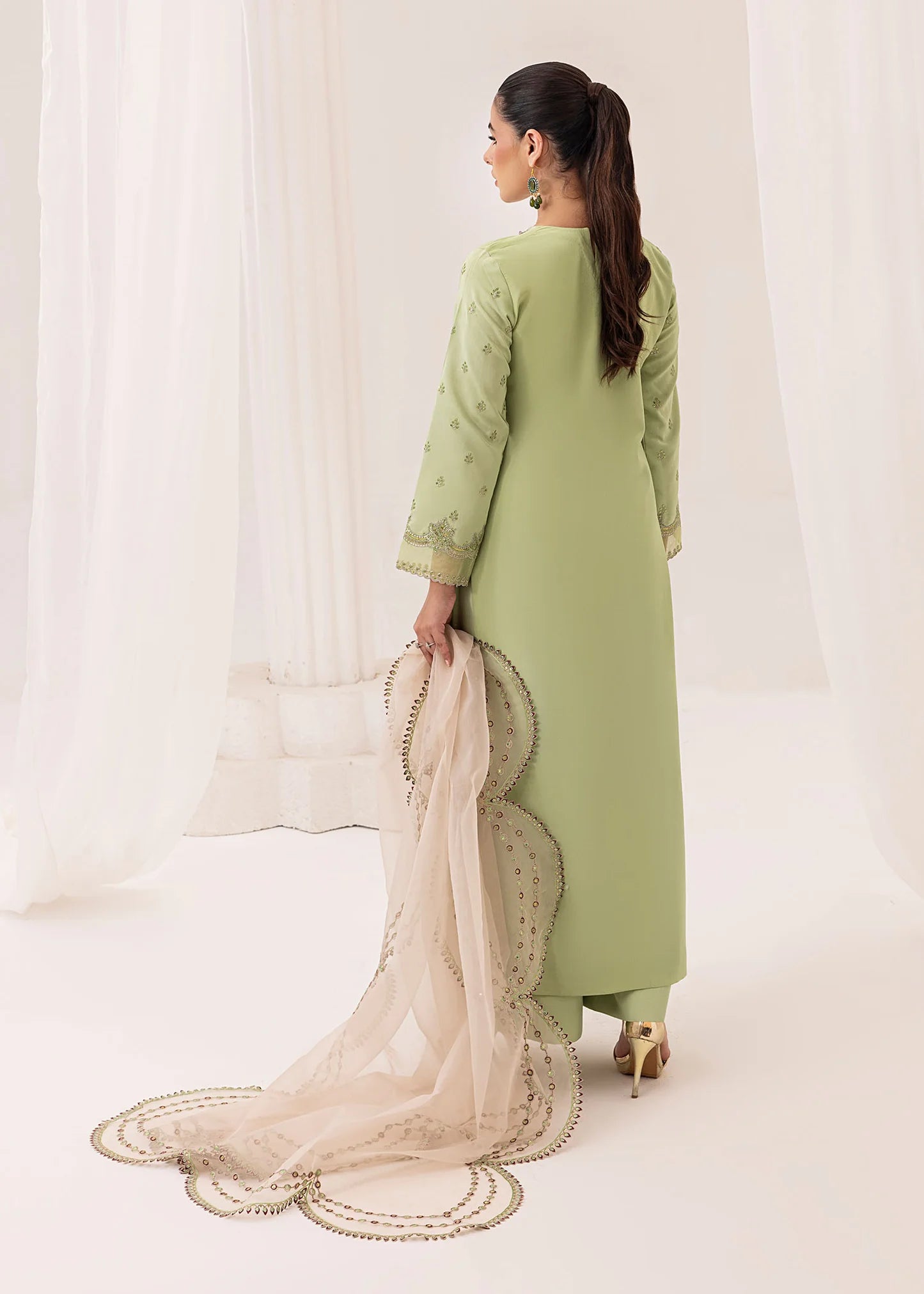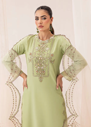 • Premium silk long shirt with embroidered neckline with crystals and pearl hand embellishment, escallaped hem details