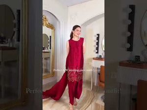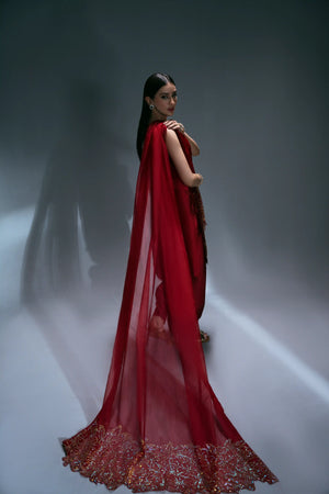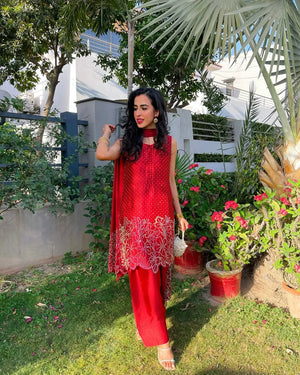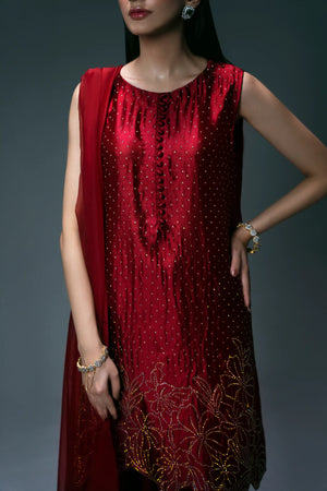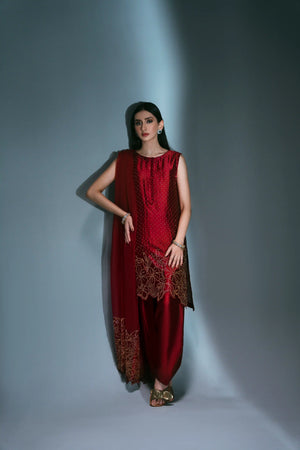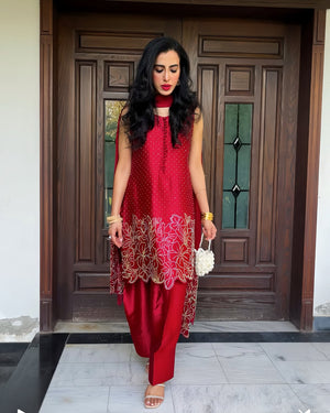 A stylish three-piece suit in red, crafted from pure tassel silk. The short shirt is beautifully embellished with a golden rhinestone floral pattern and features an intricate silk thread cutwork hemline. It is paired with a belted shalwar for a chic silhouette and a pure organza dupatta. The dupatta's border on the shorter side is enhanced with delicate cutwork and rhinestone detailing.