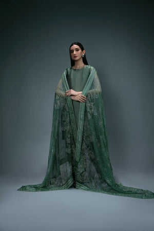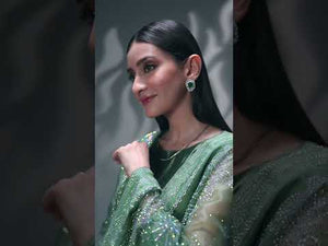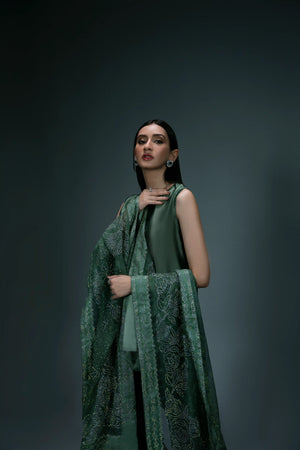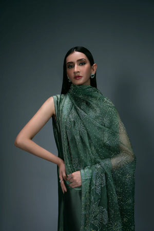 An elegant three-piece suit in dark green, featuring a plain short shirt made from pure tassel silk. It is paired with a traditional shalwar, highlighted with a subtle rhinestone spray that complements the base color. The look is completed with a pure organza dupatta, beautifully adorned with silver rhinestones in a floral pattern, adding a touch of sophistication.