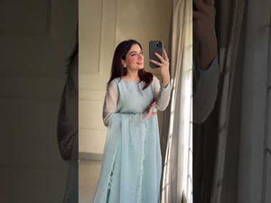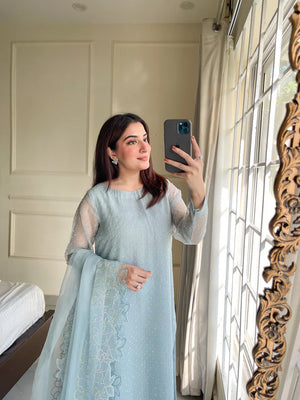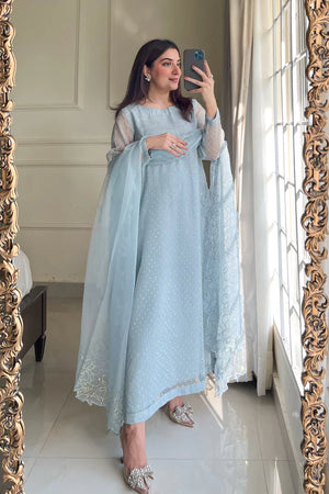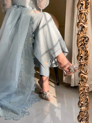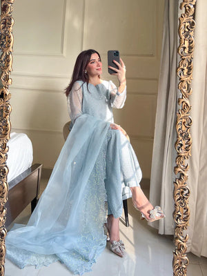A graceful three-piece set in sky blue, featuring a long pure organza shirt with a silver rhinestone spray for a subtle sparkle. It is paired with a pure organza dupatta adorned with floral patterns and rhinestone-embellished borders. The dupatta edges are outlined with silk thread and finished with delicate cutwork. The ensemble is completed with elegant pure tassel silk trousers for a refined look.