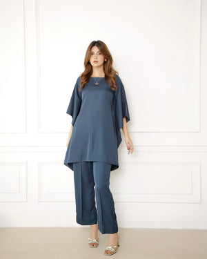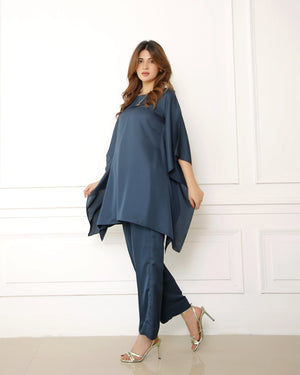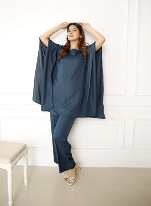 A pure georgette short square kaftan in a vibrant sea teal shade, paired with slightly loose pants for a comfortable yet stylish casual look. The flowy fabric of the kaftan offers ease of movement, making it perfect for effortless style with a refreshing pop of color.