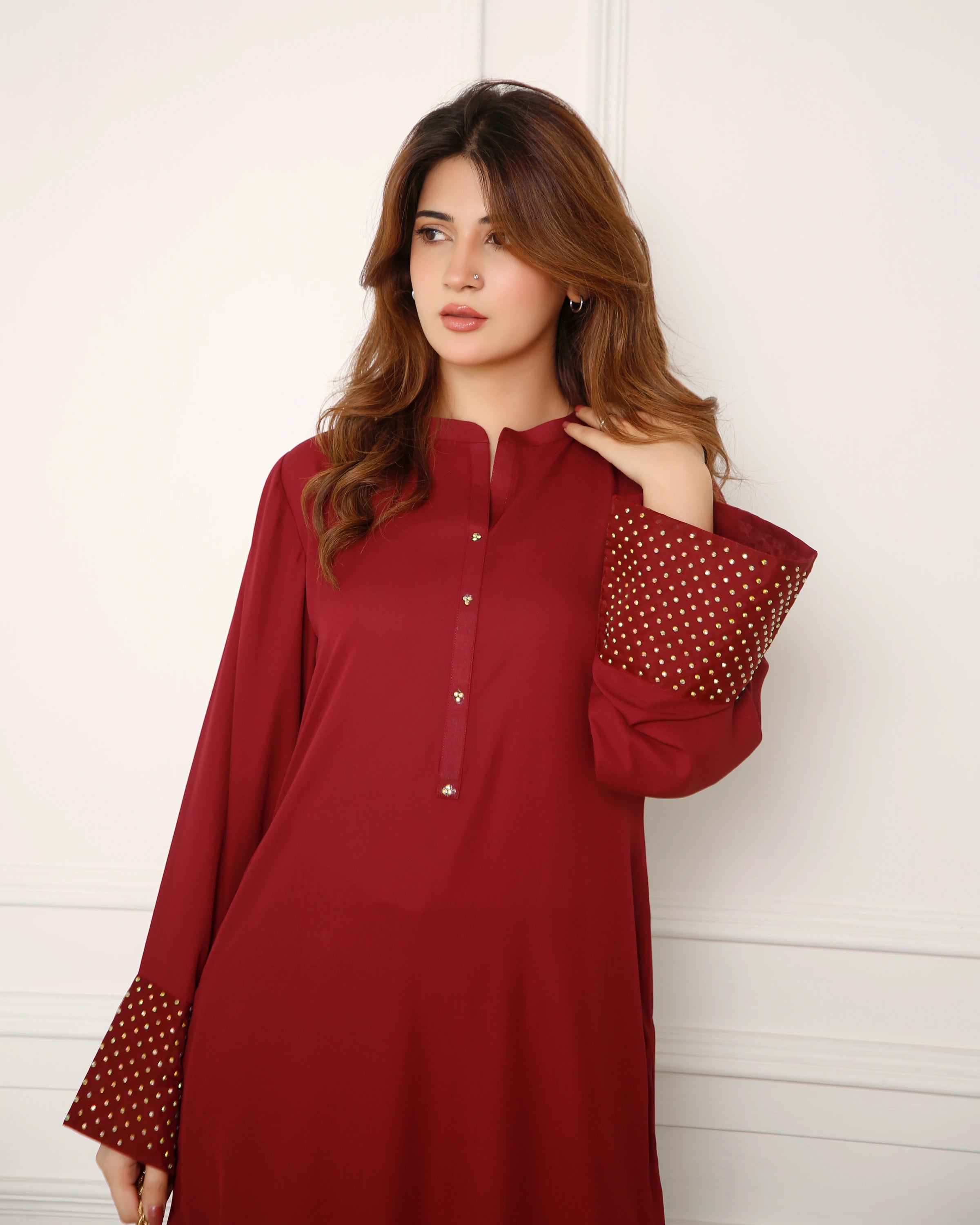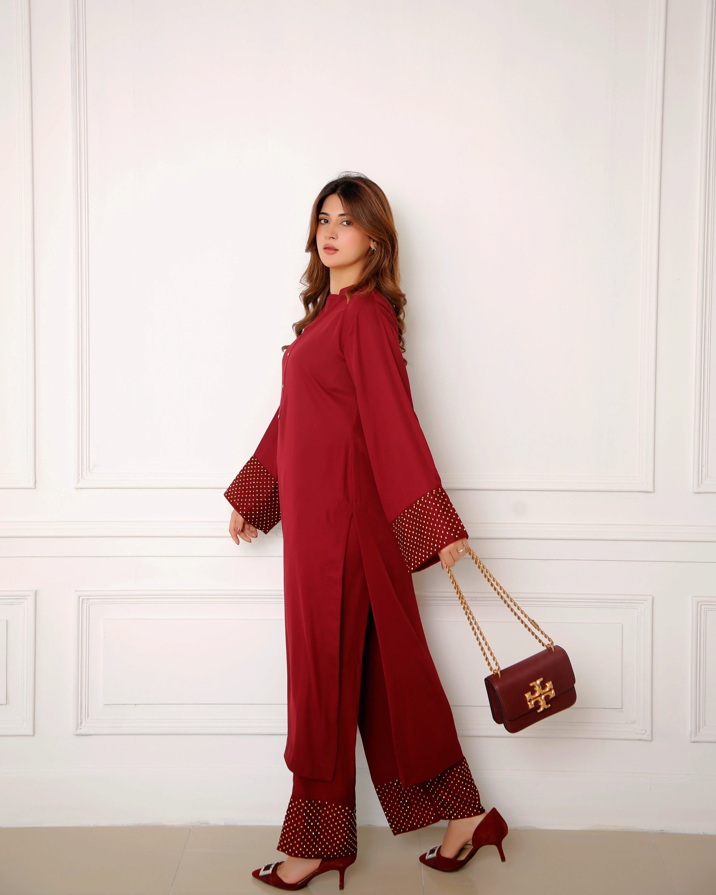 A pure georgette long red shirt featuring a ban collar and button placket adorned with rhinestones for a sparkling touch. The ensemble is paired with light palazzo-style pants. Both the sleeves and pant bottoms are accented with organza patches embellished with a rhinestone spray, adding elegance and glamour. Perfect for festive occasions or evening gatherings, this outfit combines comfort with a touch of sparkle.