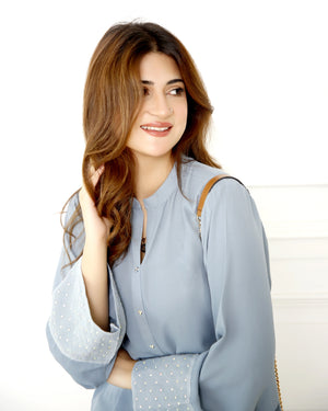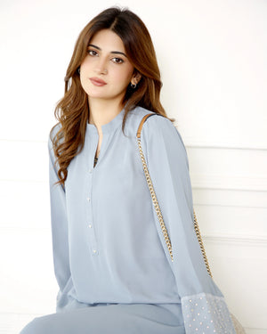 An ice blue long shirt made from pure georgette, featuring a ban collar and button placket adorned with rhinestones for a touch of elegance. Paired with light palazzo-style pants, the outfit is further enhanced by organza patches on the sleeves and pant bottoms, beautifully embellished with a rhinestone spray. This ensemble is perfect for festive occasions or evening gatherings, blending comfort with a glamorous sparkle.