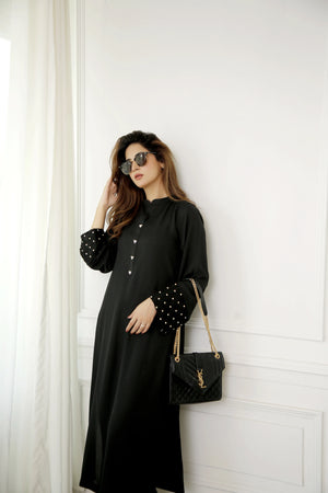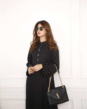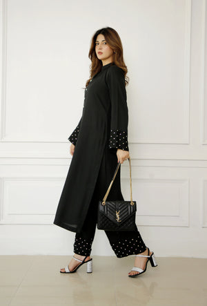 A pure georgette long black shirt with a ban collar and button placket adorned with rhinestones for a subtle sparkle. Paired with light palazzo-style pants, the outfit is elevated with organza patches on the sleeves and pant bottoms, embellished with a spray of rhinestones. This elegant ensemble is perfect for festive occasions or evening gatherings, offering a blend of comfort and glamour.