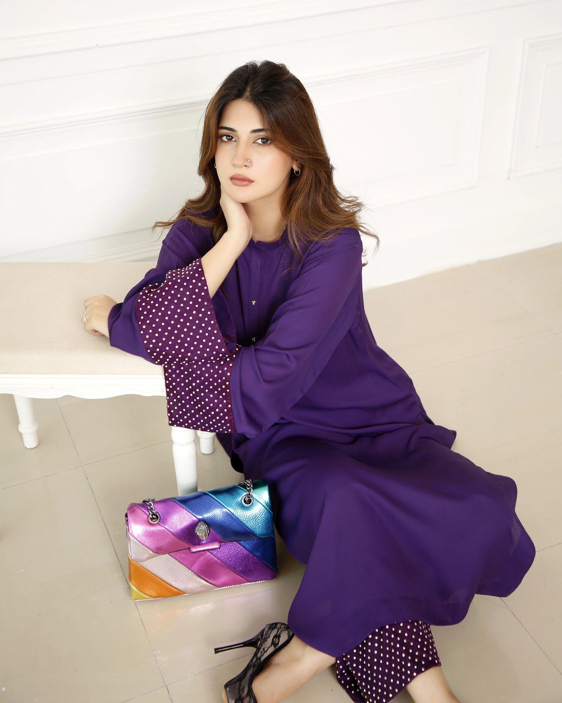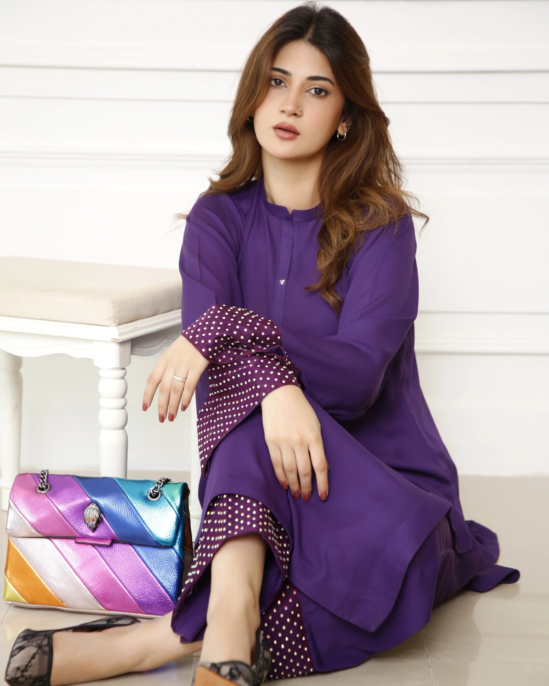 A pure georgette long purple shirt with a ban collar and button placket adorned with rhinestones for a touch of sparkle. It is paired with light palazzo-style pants. The sleeves and pant bottoms are enhanced with organza patches, beautifully embellished with a rhinestone spray for added elegance. Perfect for festive occasions or evening gatherings, this ensemble offers a blend of comfort and glamour.