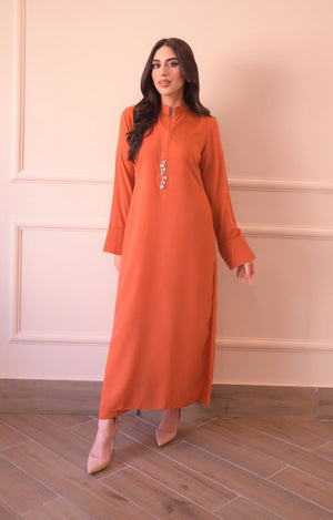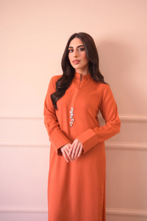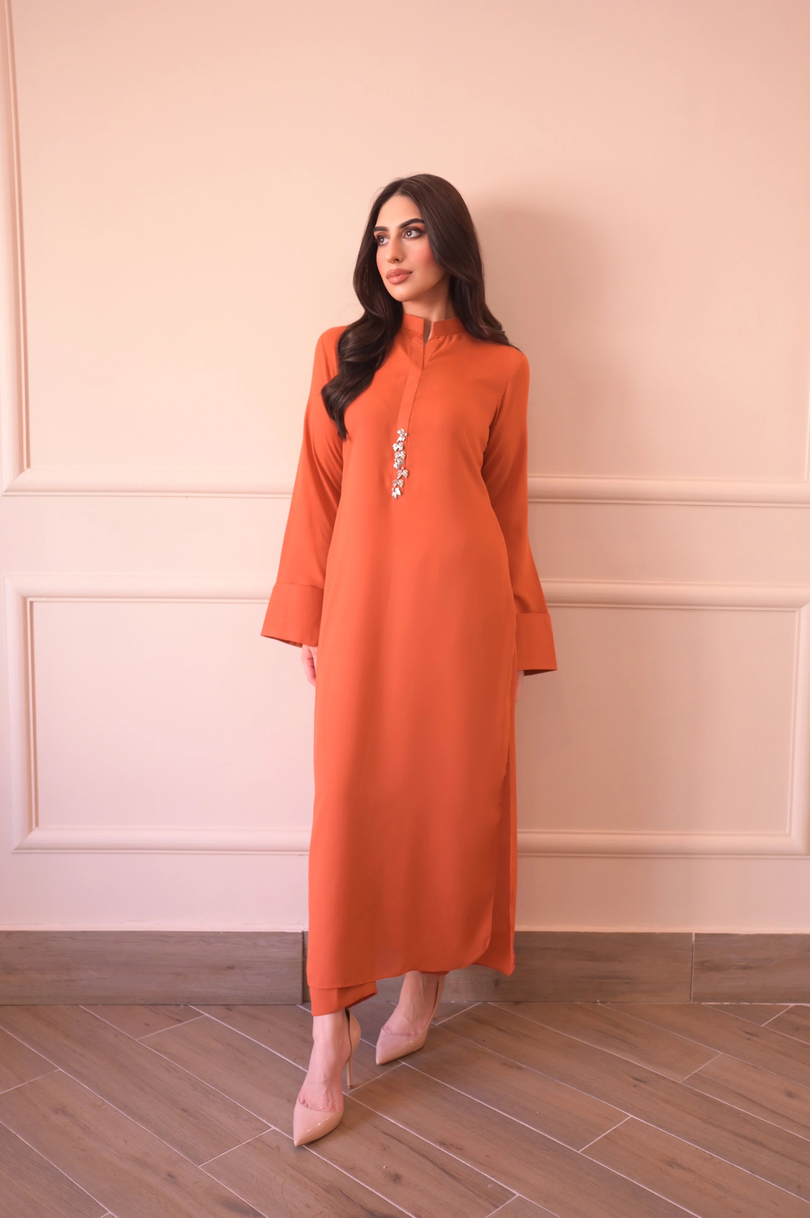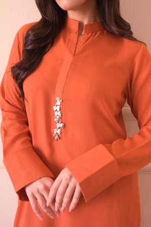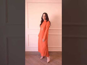 A pure Korean coral orange georgette suit with a modern, casual style. The shirt features a slightly rounded hem with a ban collar placket adorned with asymmetrical metallic buttons and a subtle pearl touch. The sleeves have folded cuffs with small slits, adding a stylish detail. Paired with straight pants, this outfit offers a smart and chic look.