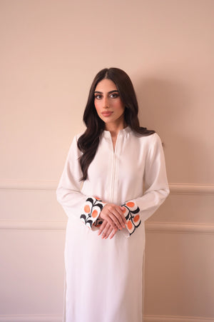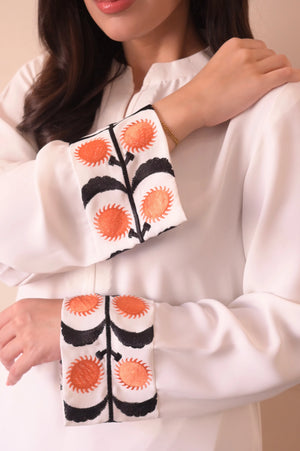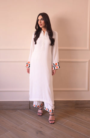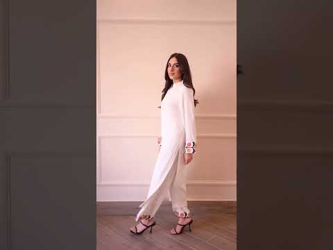 A pure Korean white georgette co-ord set featuring elegant patches on the sleeves and trouser bottoms with intricate machine work. This detailing adds sophistication and a refined look to the outfit, making it perfect for any occasion.