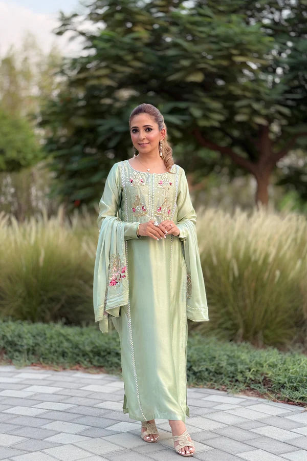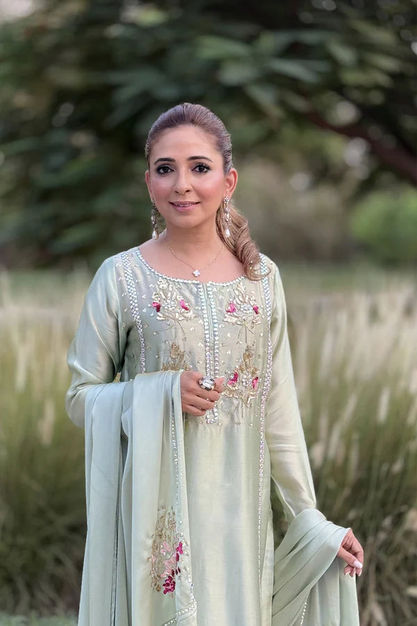 A luxurious pure tassel silk outfit in a soft pistachio green, featuring a long shirt paired with straight pants. The shirt and chiffon silk dupatta are adorned with intricate handwork, embellished with Swarovski sequins and bead detailing, giving the ensemble a rich and elegant feel.